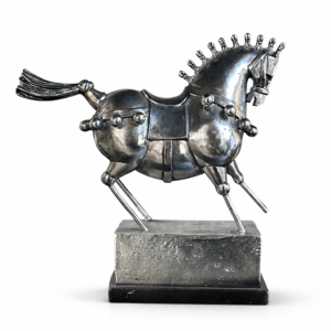 Heykelsi at başı silueti, ürüne güçlü bir görsel etki kazandırır ve onu sıradan bir dekor objesinden çıkarıp galeri hissi veren bir odak noktasına dönüştürür.