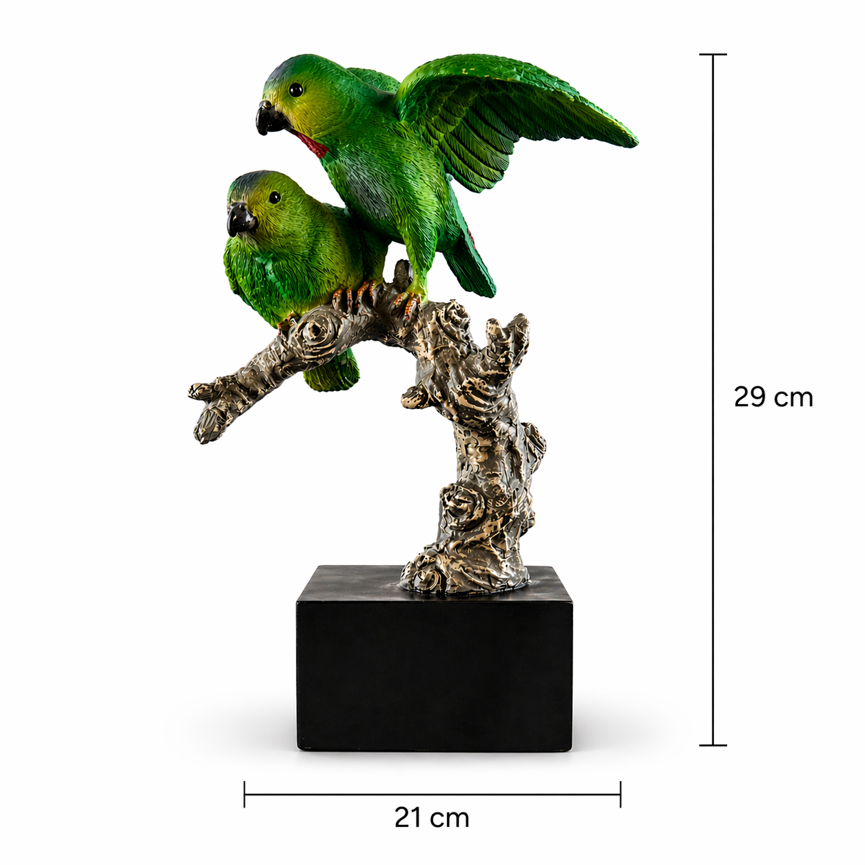 Canlı renkleri ve etkileyici tasarımıyla dikkat çeken 2’li yeşil papağan biblosu, yaşam alanlarınıza enerjik ve egzotik bir hava kazandırır. Doğal ağaç dalı formundaki detaylı gövdesi üzerinde konumlanan iki sevimli papağan figürü, dekorasyonda fark yaratan şık bir aksesuar olarak öne çıkar. Yeşil tonların canlı görünümü ve gerçekçi işçilik detayları sayesinde salon, antre, ofis, vitrin, konsol ve masa üstü dekorasyonunda göz alıcı bir tamamlayıcıdır.