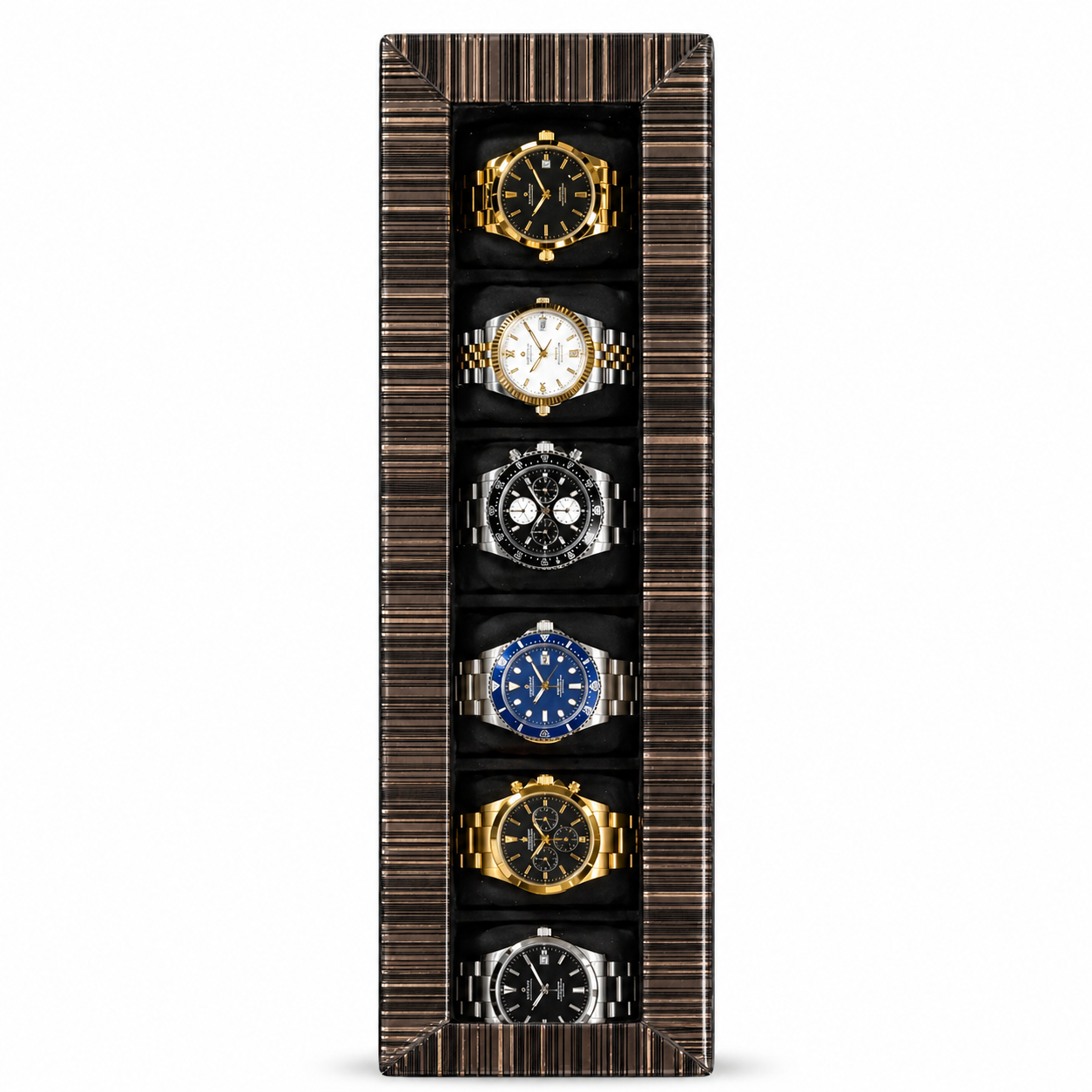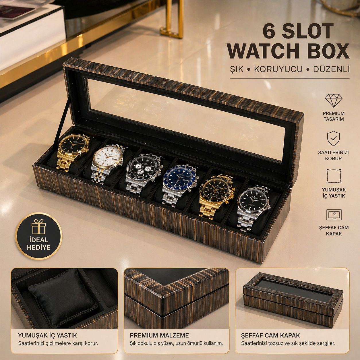 İç kısmında bulunan yumuşak bölmeler ve özel yastıklı alanlar sayesinde saatleriniz düzenli şekilde muhafaza edilir. Metal, deri, klasik veya spor saat modelleri için uygun olan bu 6’lı saat kutusu, hem günlük kullanım hem de koleksiyon saklama amacıyla idealdir.