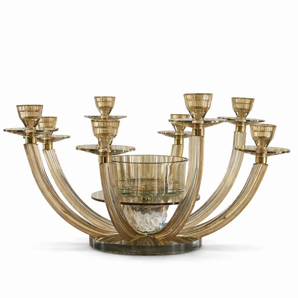 Dekorasyonda zarafeti ön plana çıkaran kristal şamdan modeli, göz alıcı tasarımı ve şık detaylarıyla yaşam alanlarınıza lüks bir dokunuş kazandırır. Altın tonlu modern görünümü ve çok kollu yapısı sayesinde yemek masası, salon, davet masası, söz, nişan, düğün ve özel organizasyonlarda dikkat çekici bir dekoratif aksesuar olarak kullanılabilir. 51,5 cm genişliği ve 32 cm yüksekliği ile masa üzerinde gösterişli bir merkez obje oluşturur.