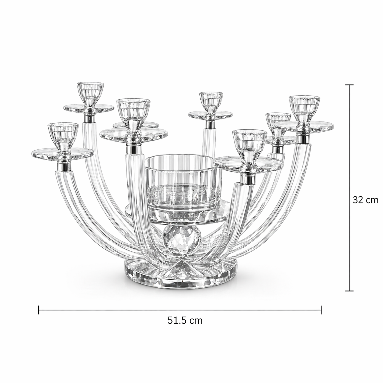 Dekorasyonda zarafeti ön plana çıkaran kristal şamdan modeli, göz alıcı tasarımı ve şık detaylarıyla yaşam alanlarınıza lüks bir dokunuş kazandırır. Altın tonlu modern görünümü ve çok kollu yapısı sayesinde yemek masası, salon, davet masası, söz, nişan, düğün ve özel organizasyonlarda dikkat çekici bir dekoratif aksesuar olarak kullanılabilir. 51,5 cm genişliği ve 32 cm yüksekliği ile masa üzerinde gösterişli bir merkez obje oluşturur.