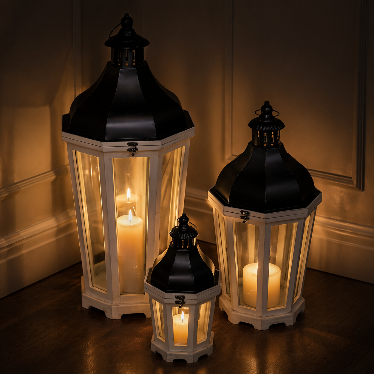 Şık tasarımı ve zarif detaylarıyla öne çıkan üst kapağı metal alt kısmı ahşap 3’lü dekoratif fener seti, yaşam alanlarınıza sıcak ve estetik bir atmosfer kazandırır. Siyah metal üst kapak detayı ile modern bir görünüm sunarken, beyaz ahşap gövdesi doğal ve ferah bir dekorasyon etkisi yaratır. Farklı boyutlarda sunulan bu 3’lü set; salon, balkon, teras, bahçe, antre, veranda ve iç mekan dekorasyonunda kullanıma uygundur.