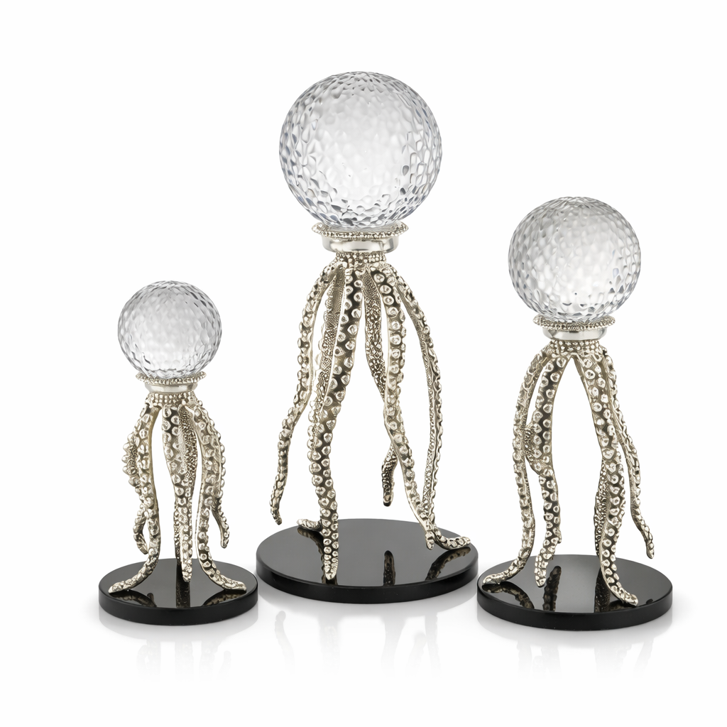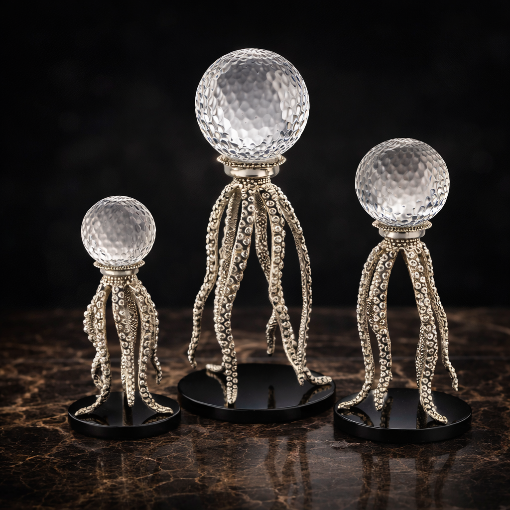 Kristal Cam Küreli Ahtapot Dekor Heykeli, okyanusun gizemini yaşam alanlarınıza taşıyan benzersiz bir dekoratif objedir. Sağlam bir taban üzerinde yükselen zarif gümüş ahtapot kolları, kesimli parlak kristal cam küreyi taşıyarak dikkat çekici ve sanatsal bir görünüm oluşturur. Deniz temalı dekorasyonları, sahil evi tasarımları ve lüks iç mekanlar için mükemmel bir tamamlayıcıdır.