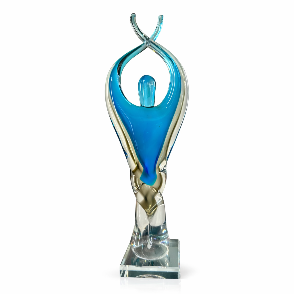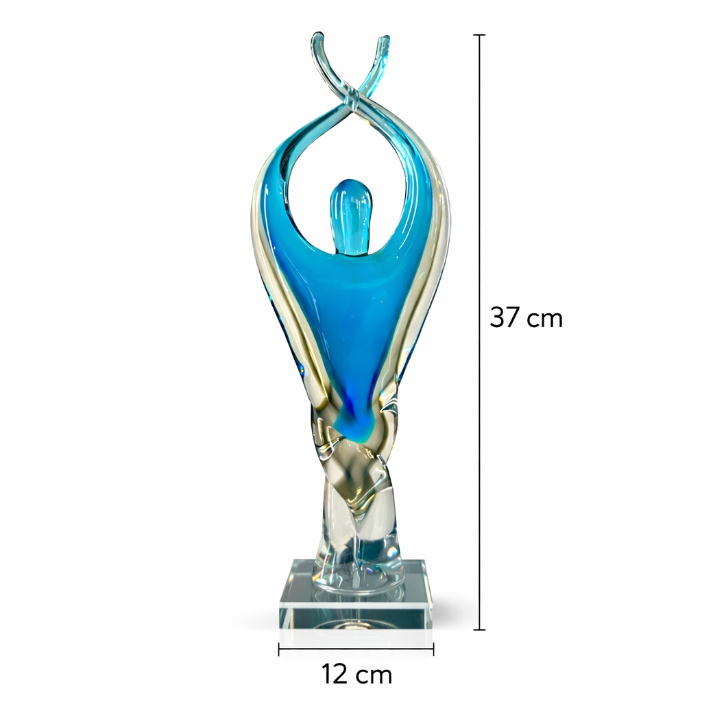 Ascension Cam Heykel, modern sanat estetiğini yansıtan soyut insan figürü tasarımıyla dikkat çeken zarif bir dekoratif objedir. Akıcı hatlara sahip mavi tonlu sanat camı, ışığı yansıtarak bulunduğu ortama estetik, modern ve etkileyici bir görünüm kazandırır.