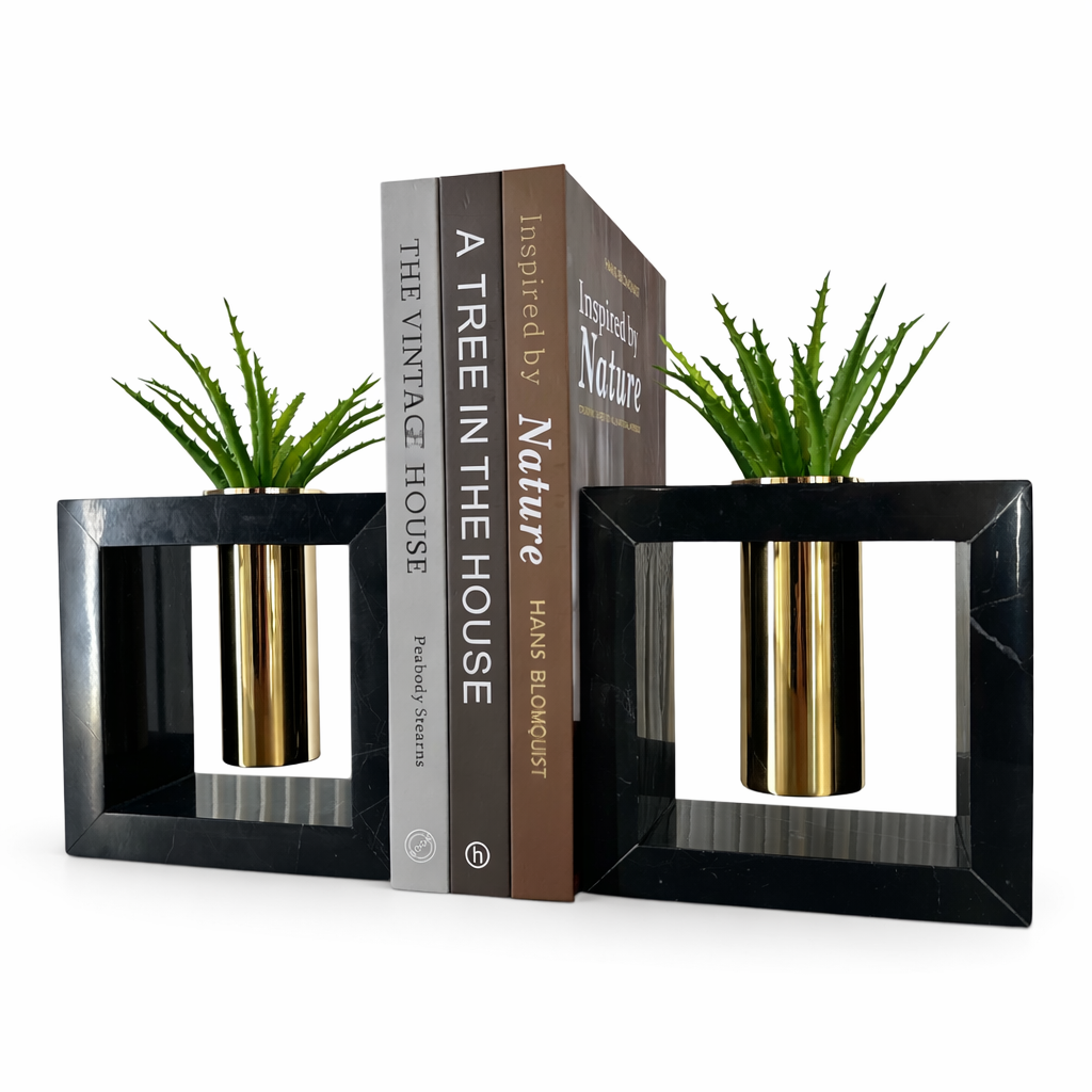 Bu modern tasarımlı bitki vazolu kitap tutucu, raflarınıza hem düzen hem de doğal bir dekoratif dokunuş kazandırır. Geometrik çerçeve tasarımı ve metal mini vazo detayı sayesinde kitaplarınızı sabit tutarken aynı zamanda bitkilerle zenginleşen estetik bir dekor oluşturur.