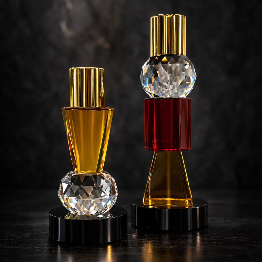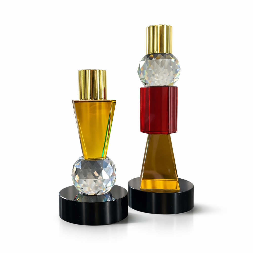 Bu lüks kristal detaylı parfüm şişesi seti, parfüm saklamayı sanatsal bir deneyime dönüştüren özel bir tasarıma sahiptir. Geometrik cam formlar, kristal kesim detaylar ve canlı renk tonları, makyaj masanızda veya dekoratif alanlarda dikkat çekici bir görünüm oluşturur. Heykelsi yapıları sayesinde sadece bir parfüm kabı değil aynı zamanda dekoratif bir sanat objesi olarak da sergilenebilir.