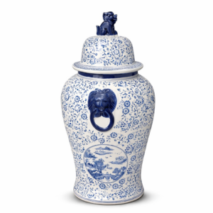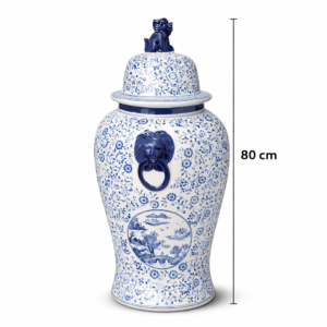 Bu mavi beyaz porselen ginger jar, etkileyici 80 cm yüksekliği ile yaşam alanlarına zamansız bir chinoiserie zarafeti kazandıran gösterişli bir dekor parçasıdır. Yoğun floral desenleri, manzara madalyon detayı, aslan başlı halka kulp görünümleri ve üst bölümde yer alan koruyucu figürlü kapağı sayesinde antre, salon, merdiven boşluğu, butik mekân ve lüks konsol düzenlemelerinde güçlü bir odak noktası oluşturur. Büyük ölçeği ve klasik sanat esintili detayları ile koleksiyon değeri hissi veren son derece seçkin bir objedir.