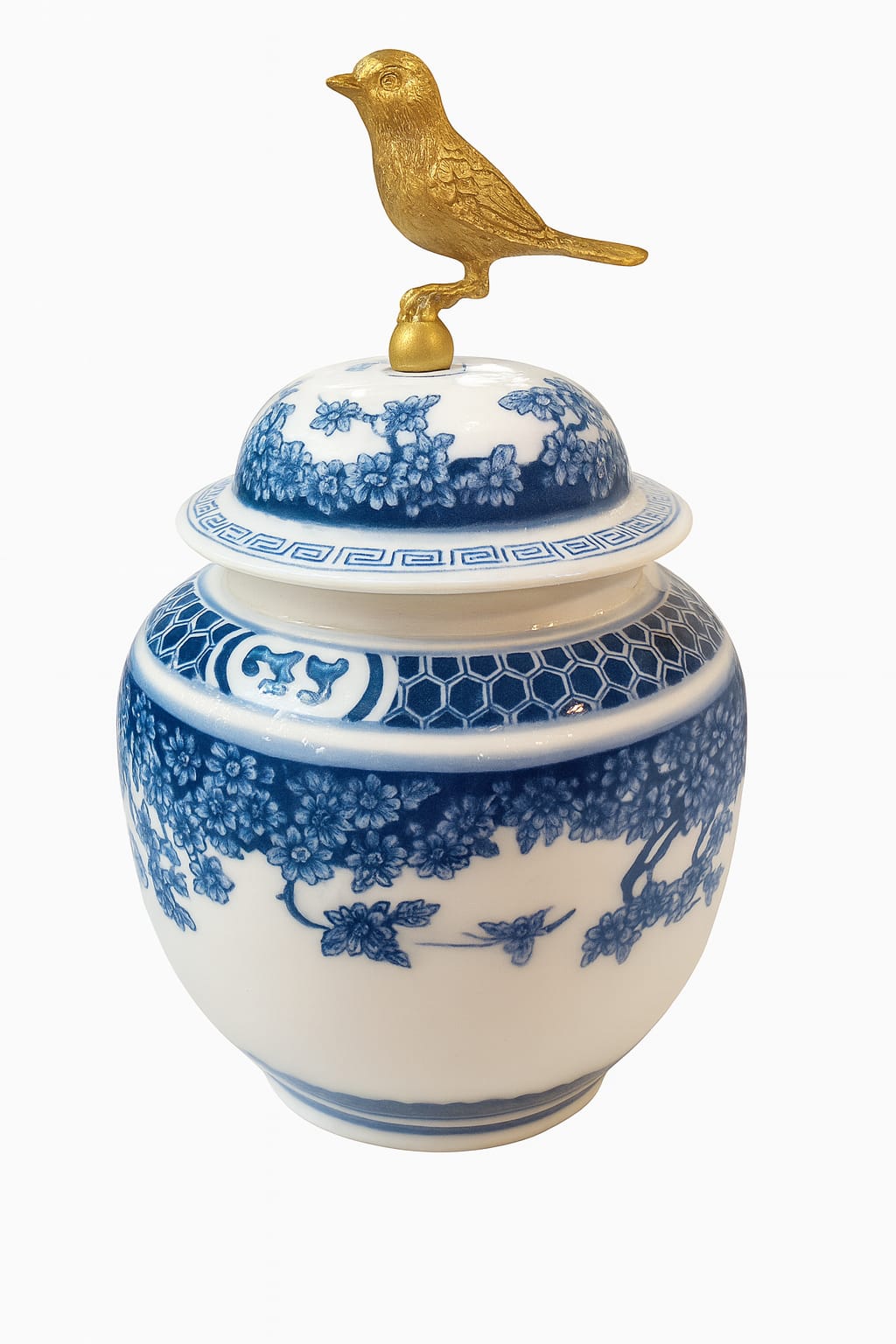 Kış bahçenize, salonunuza veya giriş alanınıza zarafet katacak bu özel mavi-beyaz porselen vazo; el işçiliğini andıran çiçek desenleri ve pirinç kuş detaylı kapağıyla sofistike bir dokunuş sunuyor. İçine yerleştirilen canlı mimoza aranjmanı, mekâna hem sıcaklık hem de doğal bir enerji katıyor.