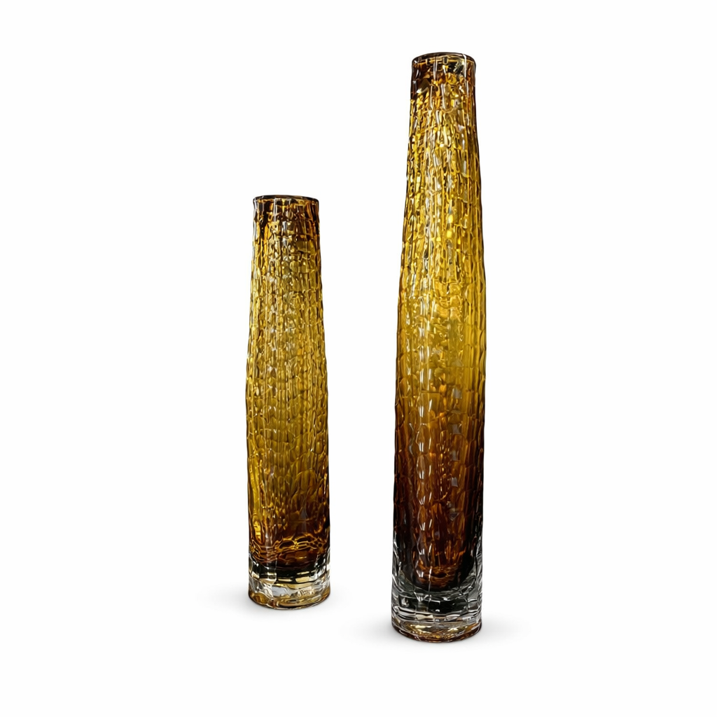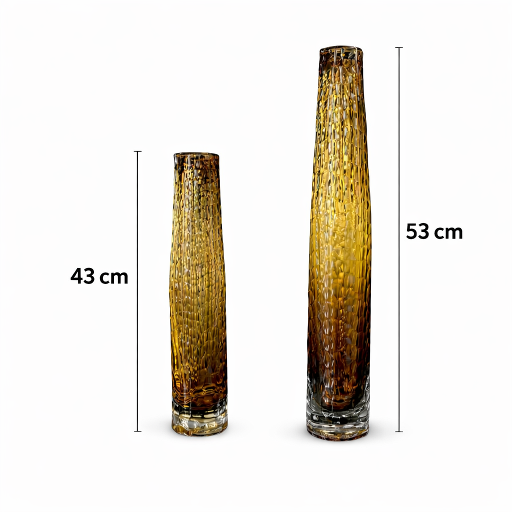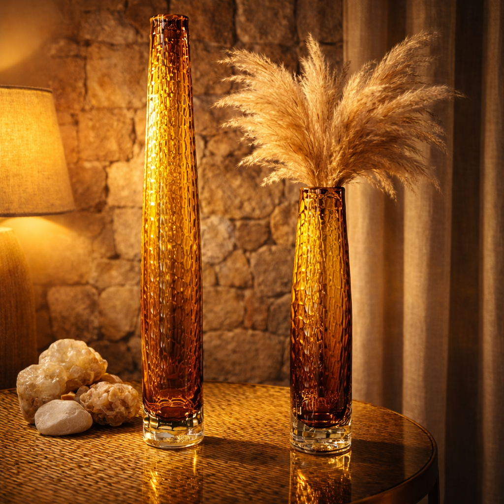 Bu şık amber cam vazo seti ile yaşam alanınıza sıcaklık ve zarafet katın. Kahverengi ve altın tonlarının birleşimi ile tasarlanan dokulu çatlak cam efekti, bulunduğu ortama lüks ve modern bir atmosfer kazandırır.
