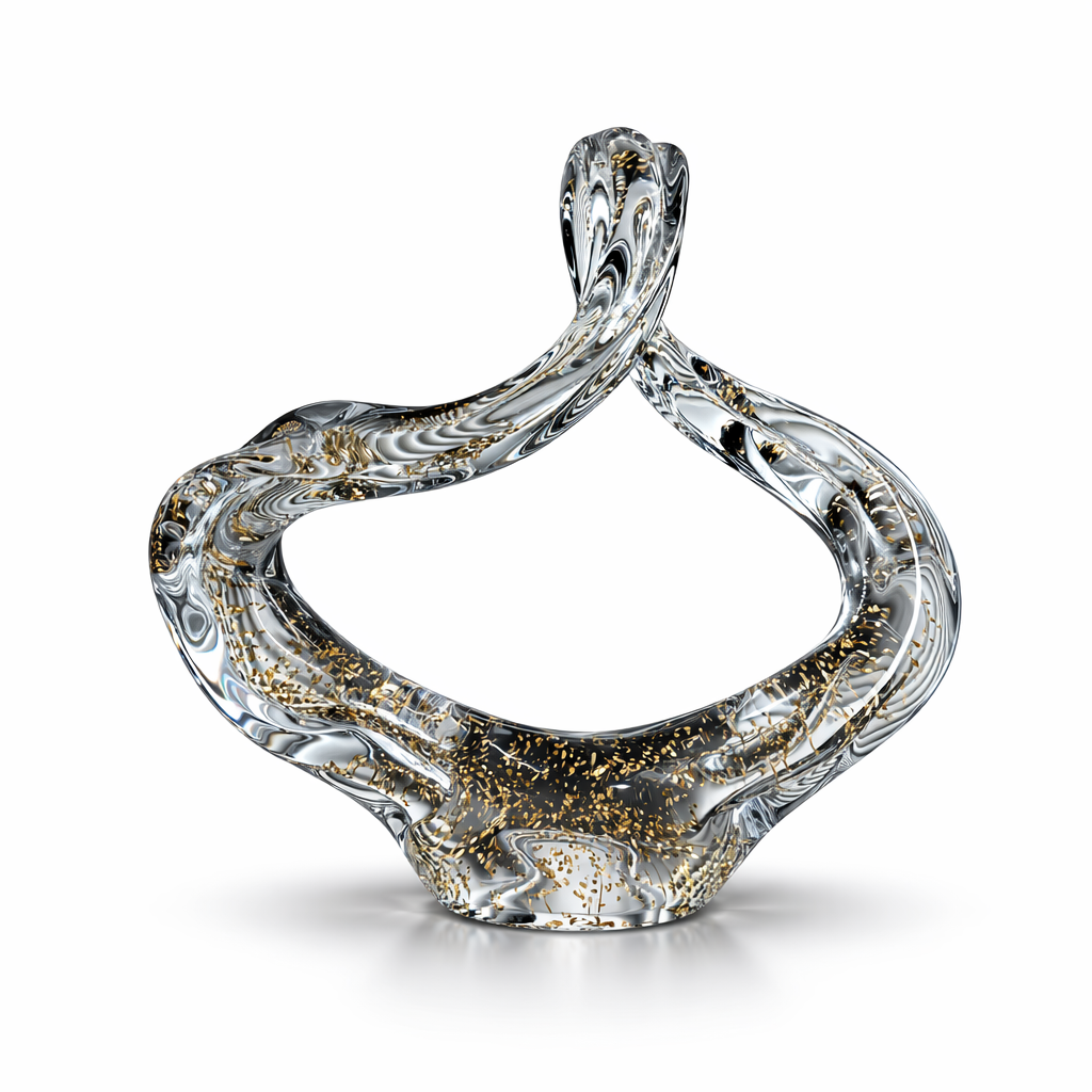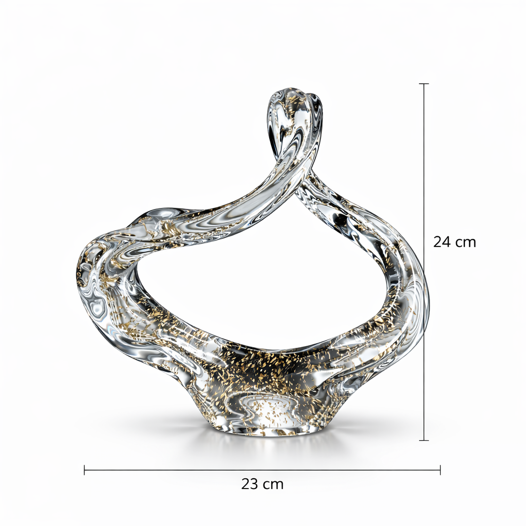 Murano tarzı modern cam dekoratif obje, zarif ve sanatsal tasarımıyla yaşam alanlarınıza dikkat çekici bir şıklık katar. Şeffaf cam içinde yer alan altın parçacıklar ve akıcı soyut form, İtalyan Murano cam sanatından ilham alan estetik bir görünüm sunar. Heykelsi kıvrımlı tasarımı sayesinde sehpa, konsol, raf veya vitrin üzerinde dekoratif merkez obje olarak kullanılabilir.