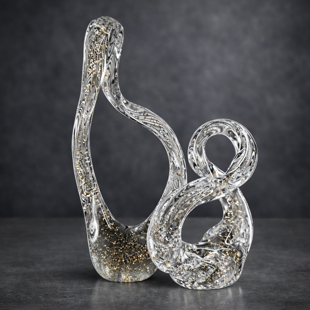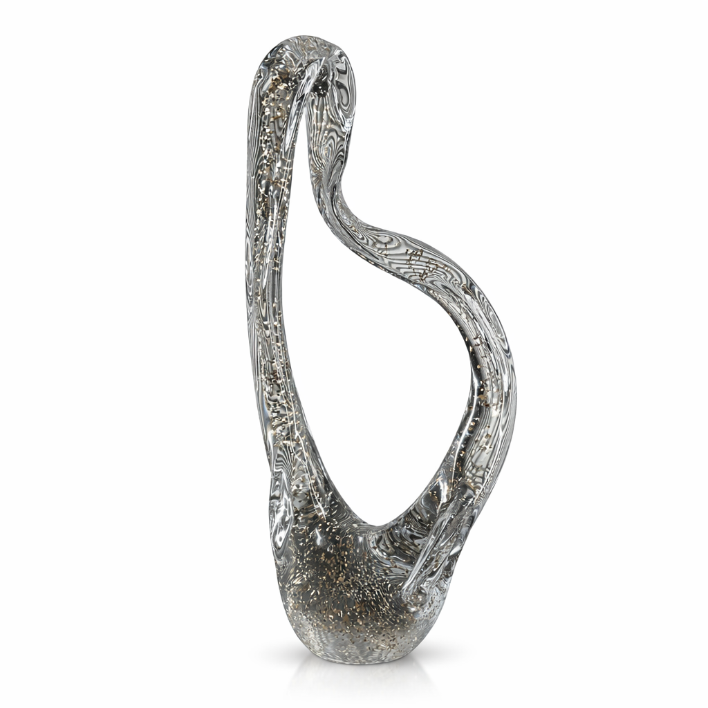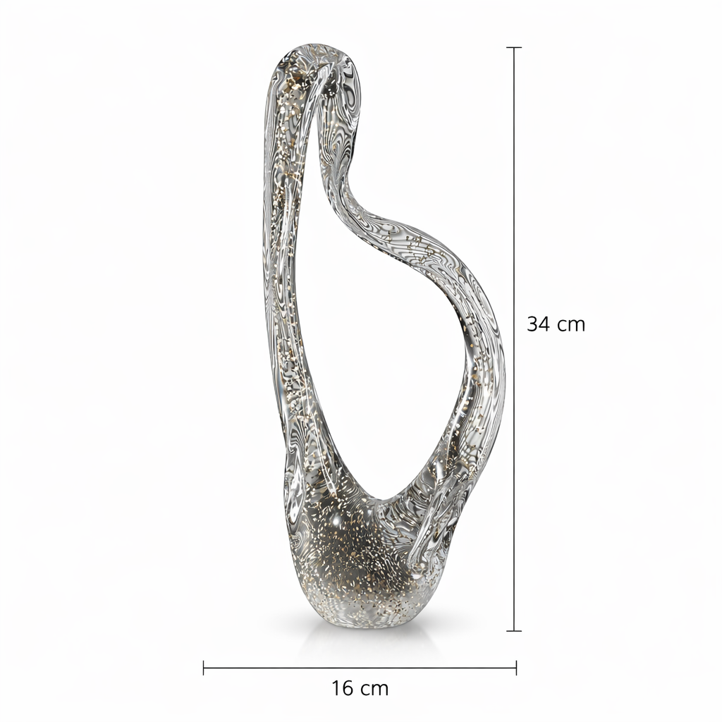 Murano tarzı modern cam dekoratif obje, zarif ve sanatsal tasarımıyla yaşam alanlarınıza dikkat çekici bir şıklık katar. Şeffaf cam içinde yer alan altın parçacıklar ve akıcı soyut form, İtalyan Murano cam sanatından ilham alan estetik bir görünüm sunar. Heykelsi kıvrımlı tasarımı sayesinde sehpa, konsol, raf veya vitrin üzerinde dekoratif merkez obje olarak kullanılabilir.