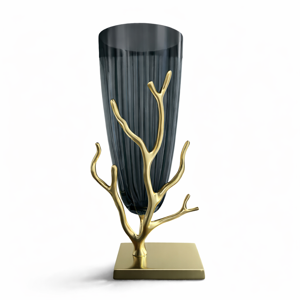 Mercan Formlu Pirinç Tabanlı Cam Vazo, modern tasarım ile doğadan ilham alan estetiği bir araya getiren dikkat çekici bir dekoratif objedir. Duman tonlu cam gövdesi ve mercan dalı formundaki pirinç tabanı sayesinde bulunduğu ortama heykelsi ve zarif bir karakter kazandırır.