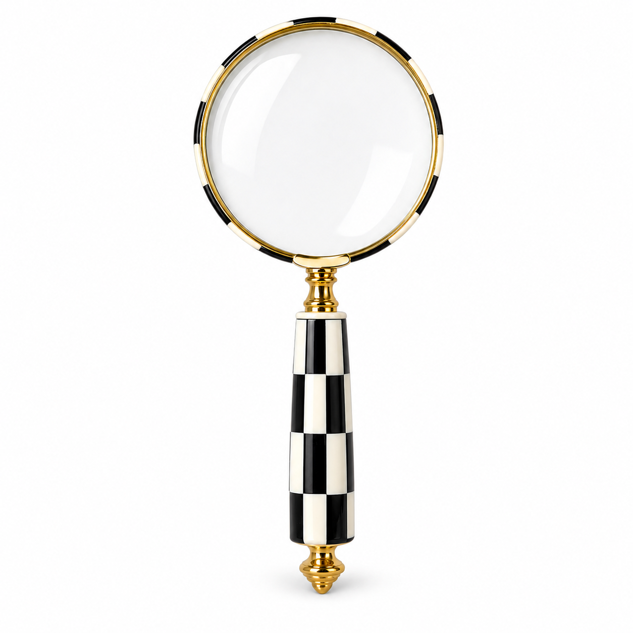 Evinize ve çalışma alanlarınıza zarafet katacak bu dekoratif büyüteç, estetik tasarımı ve şık detaylarıyla dikkat çeker. Siyah beyaz desenli sap kısmı ve gold metal çerçevesi sayesinde modern, klasik ve lüks dekorasyon stilleriyle mükemmel uyum sağlar. Hem işlevsel hem de dekoratif bir aksesuar olarak masaüstü, kitaplık, sehpa, konsol ve ofis dekorasyonunda kullanıma uygundur.