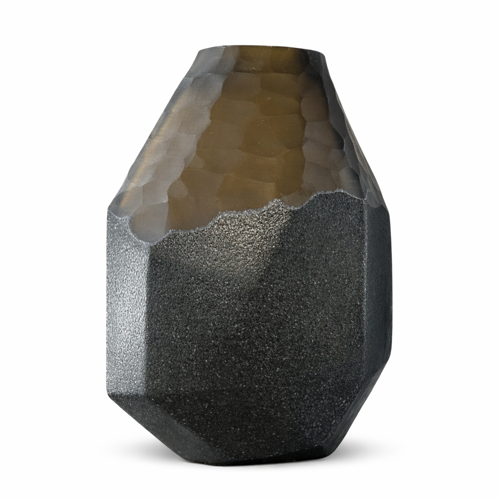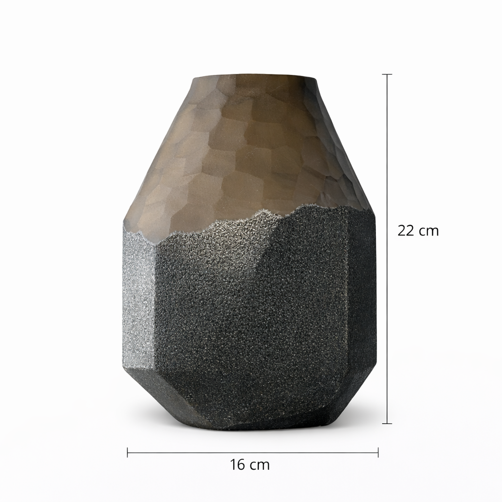 Bu modern geometrik dekoratif vazo, çarpıcı tasarımıyla yaşam alanlarınıza sanatsal ve çağdaş bir dokunuş kazandırır. Fasetli siyah gövde ve çekiç dokulu altın üst yüzey kombinasyonu sayesinde minimalizm ve modern lüks estetiğini bir araya getirir. Heykelsi formu sayesinde raf, konsol, sehpa veya giriş alanlarında dekoratif obje ya da vazo olarak kullanılabilir.