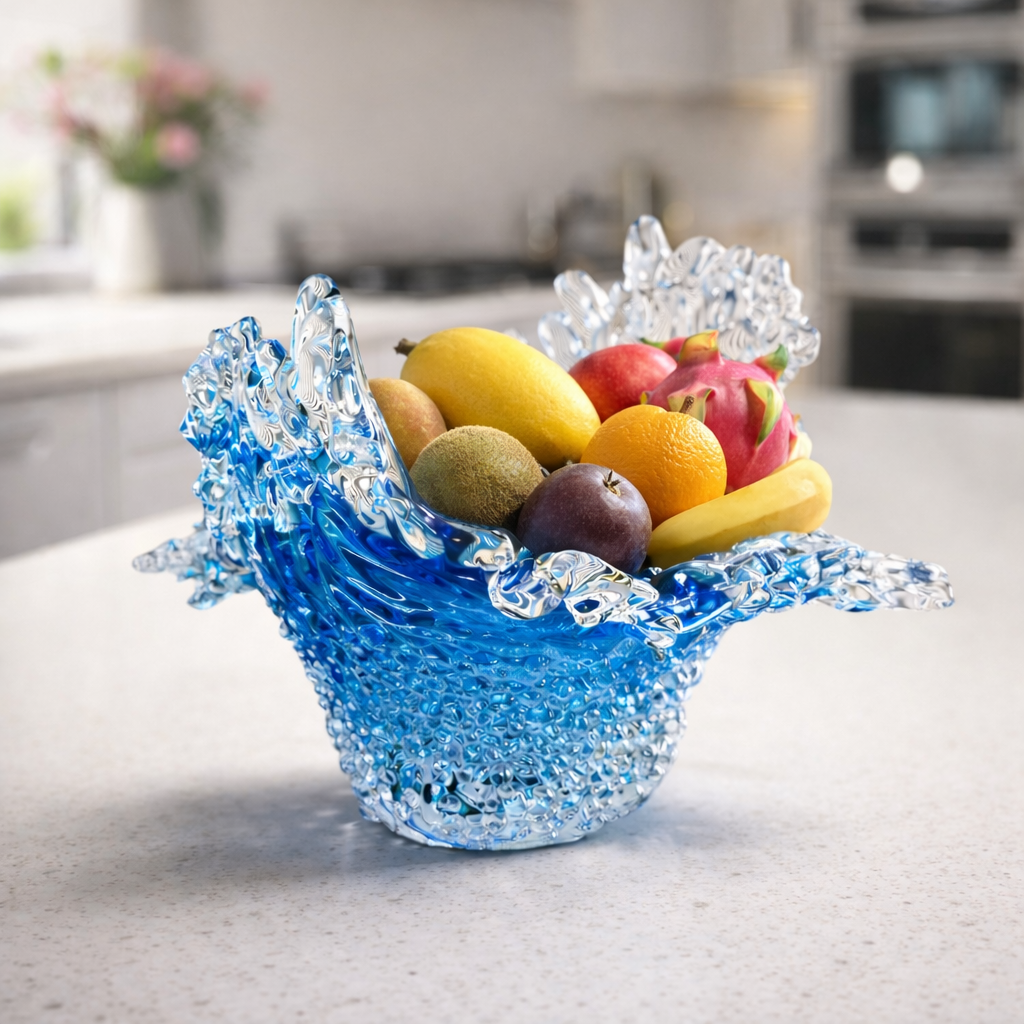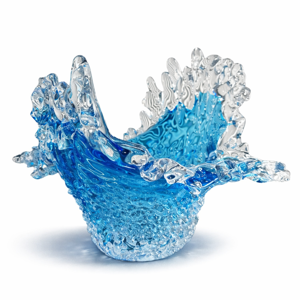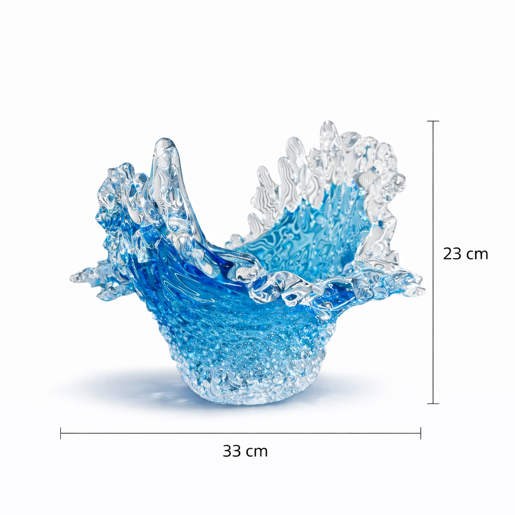Turkuazın derinliği ile kristal şeffaflığın çarpıştığı bu form, okyanusun enerjisini mekâna taşır. Kenarlardaki kıvrımlı yükselişler, köpüren bir dalganın zirvesini; alt yüzeydeki kabarcıklı dokular ise suyun içindeki hareketi temsil eder.