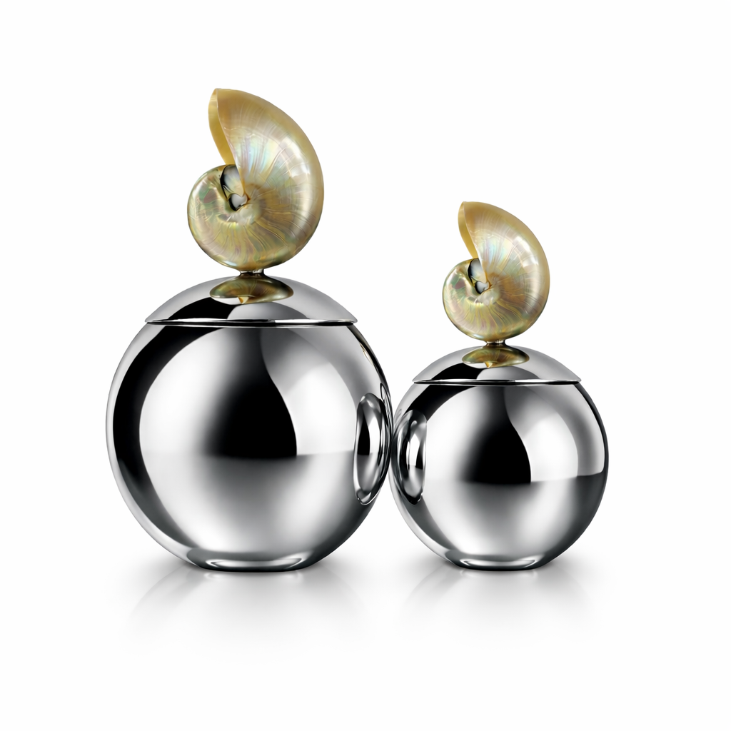 Modern tasarım ile doğanın eşsiz estetiğini bir araya getiren bu ikili gümüş küre seti, dekorasyonunuza hem sanatsal hem de lüks bir dokunuş katar. Üst kısmında yer alan doğal nautilus kabuk detayı, ürüne benzersiz ve dikkat çekici bir karakter kazandırır.