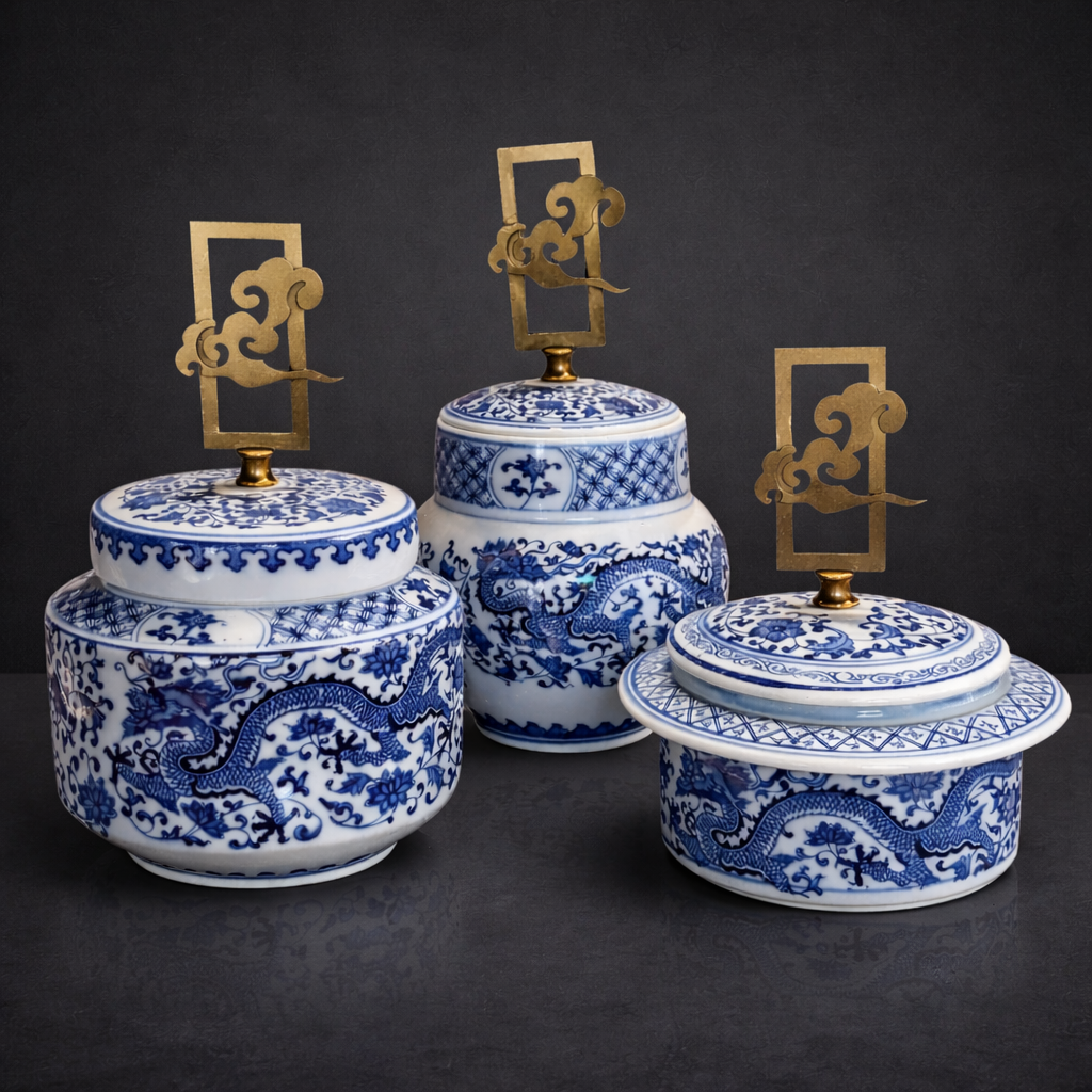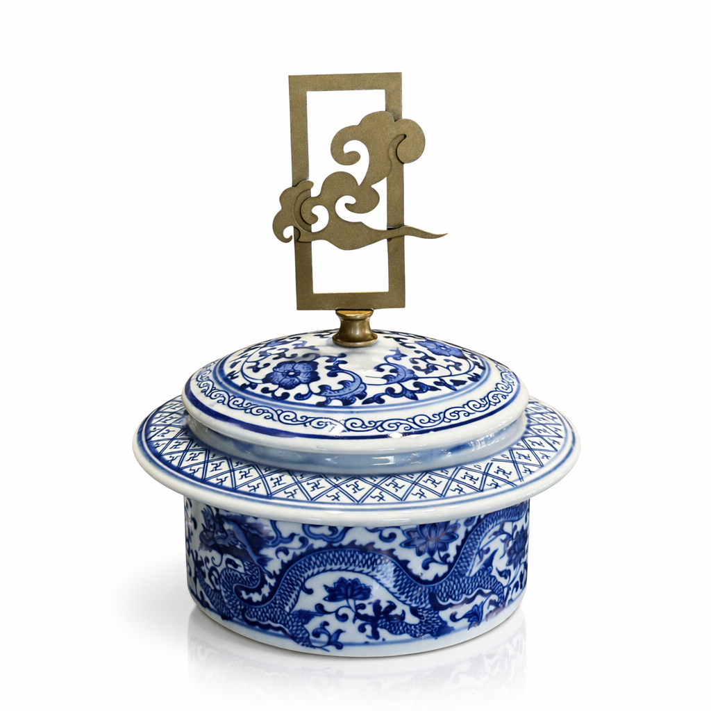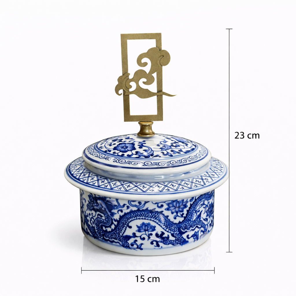 Blue Blanc ejderha desenli porselen ginger jar, geleneksel Çin porselen sanatından ilham alan zarif bir dekoratif objedir. Kobalt mavi ejderha ve floral motiflerle süslenmiş beyaz porselen yüzey, klasik Ming dönemi porselen estetiğini yansıtır. Kapağındaki bulut formunda metal tutamak, Asya sanatında uyum ve bereketi simgeler ve ürüne sanatsal bir dokunuş katar.