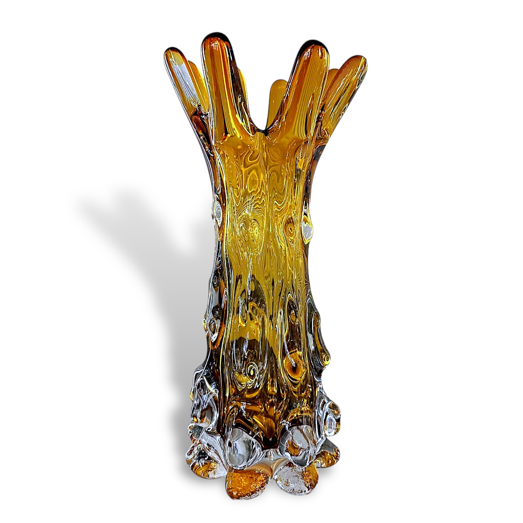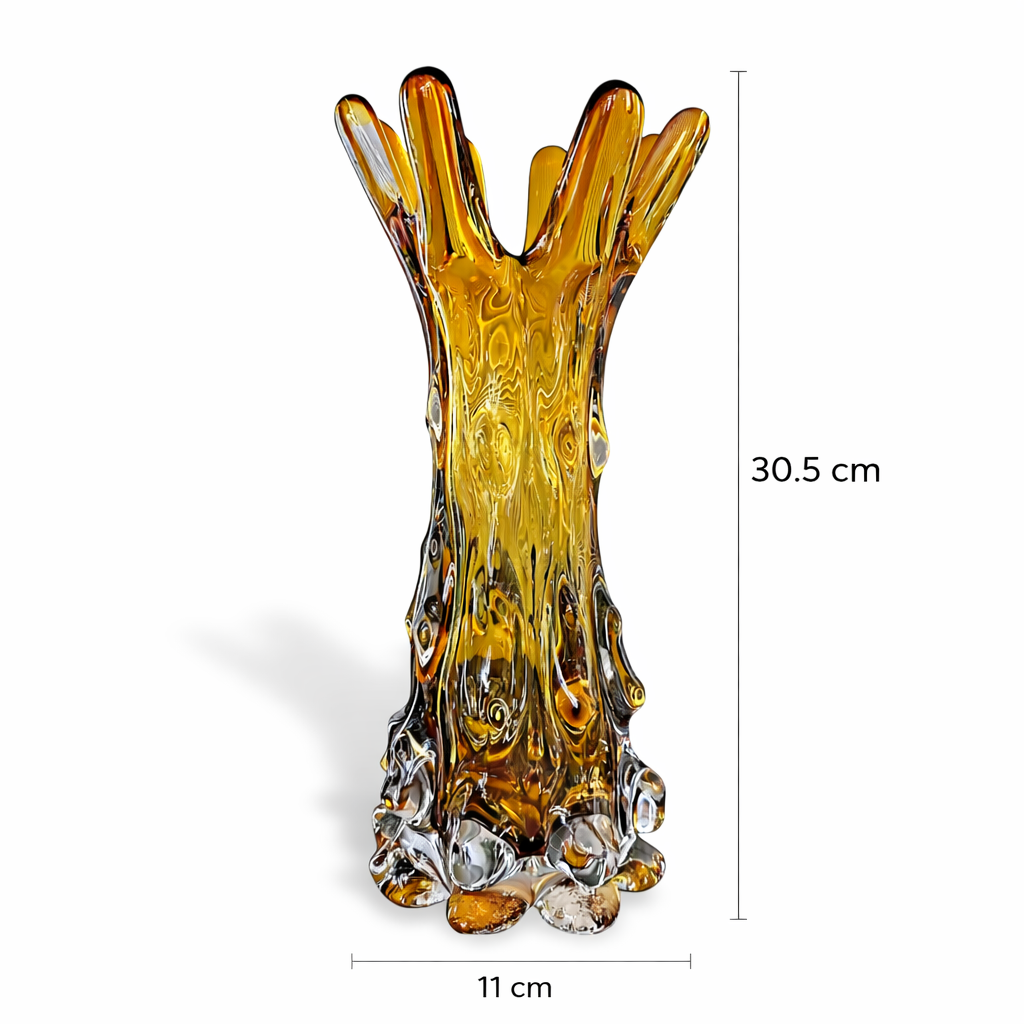 Akışkan cam dokusunun sanatsal bir yorumu olan Elara Vase, amber tonlarının sıcak yansımaları ve organik yükselen formuyla modern dekorasyona zarif bir karakter kazandırır. Işığı kıran yüzey detayları her açıdan farklı bir derinlik hissi yaratırken, heykelsi yapısı sayesinde tek başına güçlü bir tasarım objesi olarak öne çıkar.