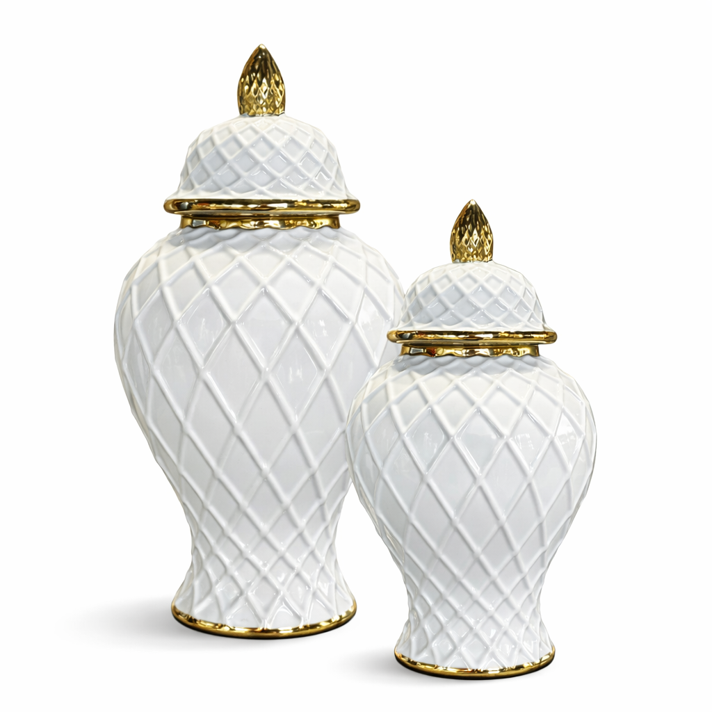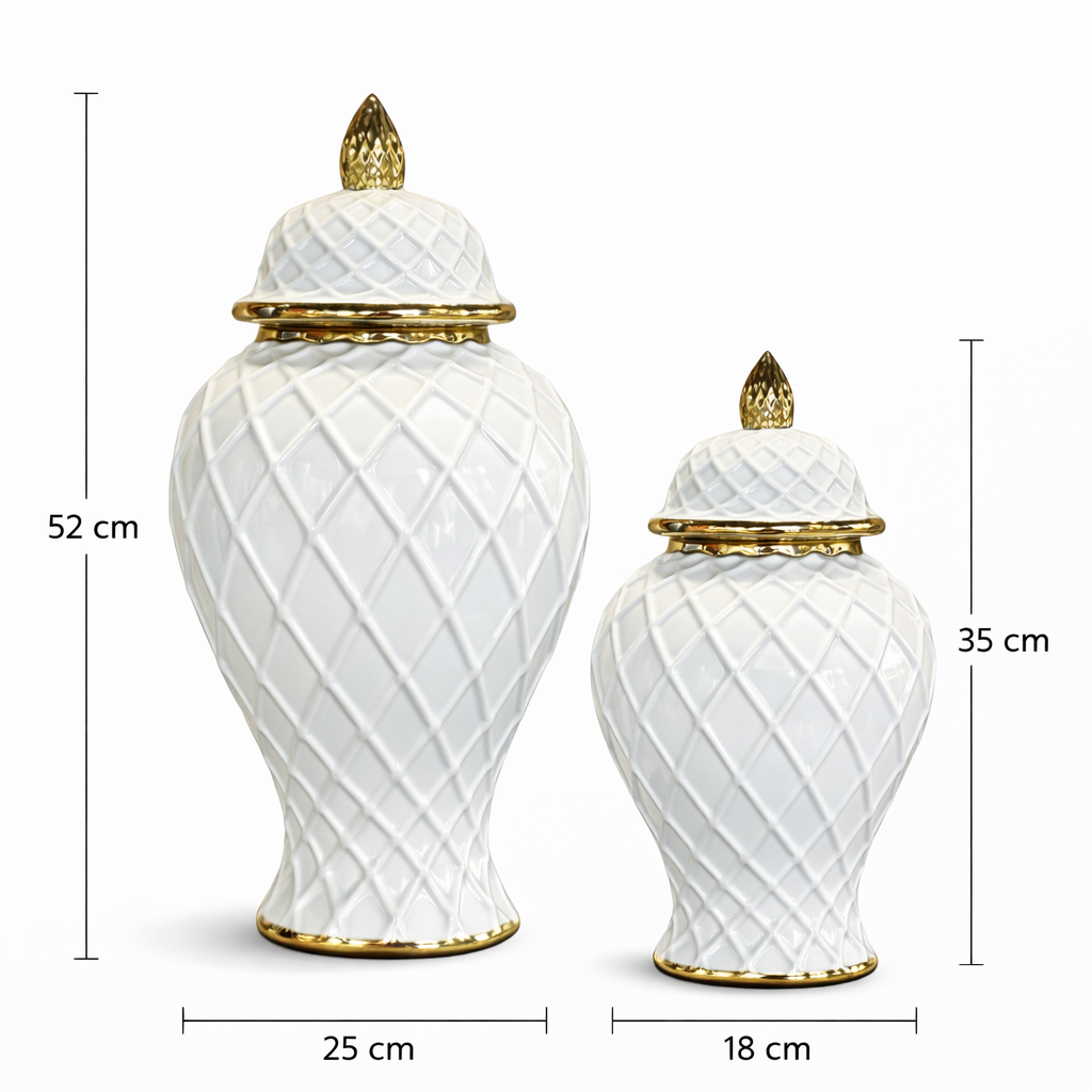 Her bir küpün kapağındaki altın renkli detay ve rim, beyaz seramik gövde ile zarif bir kontrast oluşturur. Klasik ginger jar formundan ilham alan bu tasarım, modern geometrik yüzey dokusuyla günümüz iç mekân dekorasyonlarına mükemmel uyum sağlar.