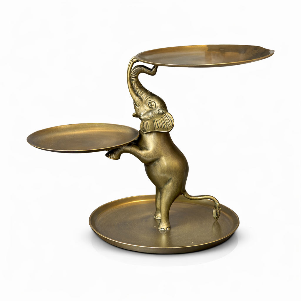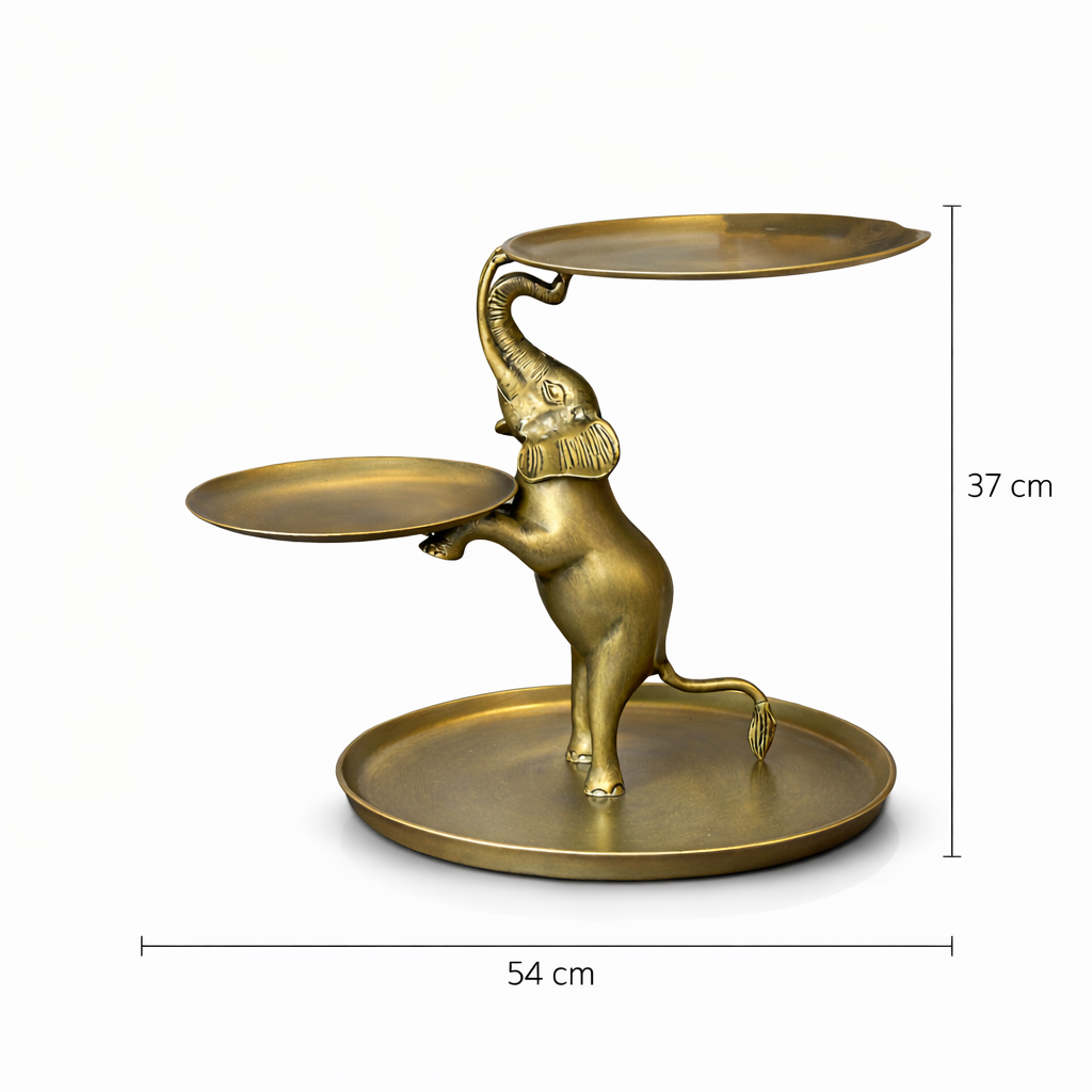 Evinize şıklık ve zarafet katacak fil figürlü 3 katlı sunum tepsisi, hem dekoratif hem de fonksiyonel kullanımıyla dikkat çekiyor. Altın tonlarında metal tasarımı sayesinde modern, klasik ve bohem dekorasyonlara mükemmel uyum sağlar.