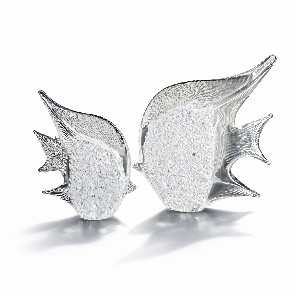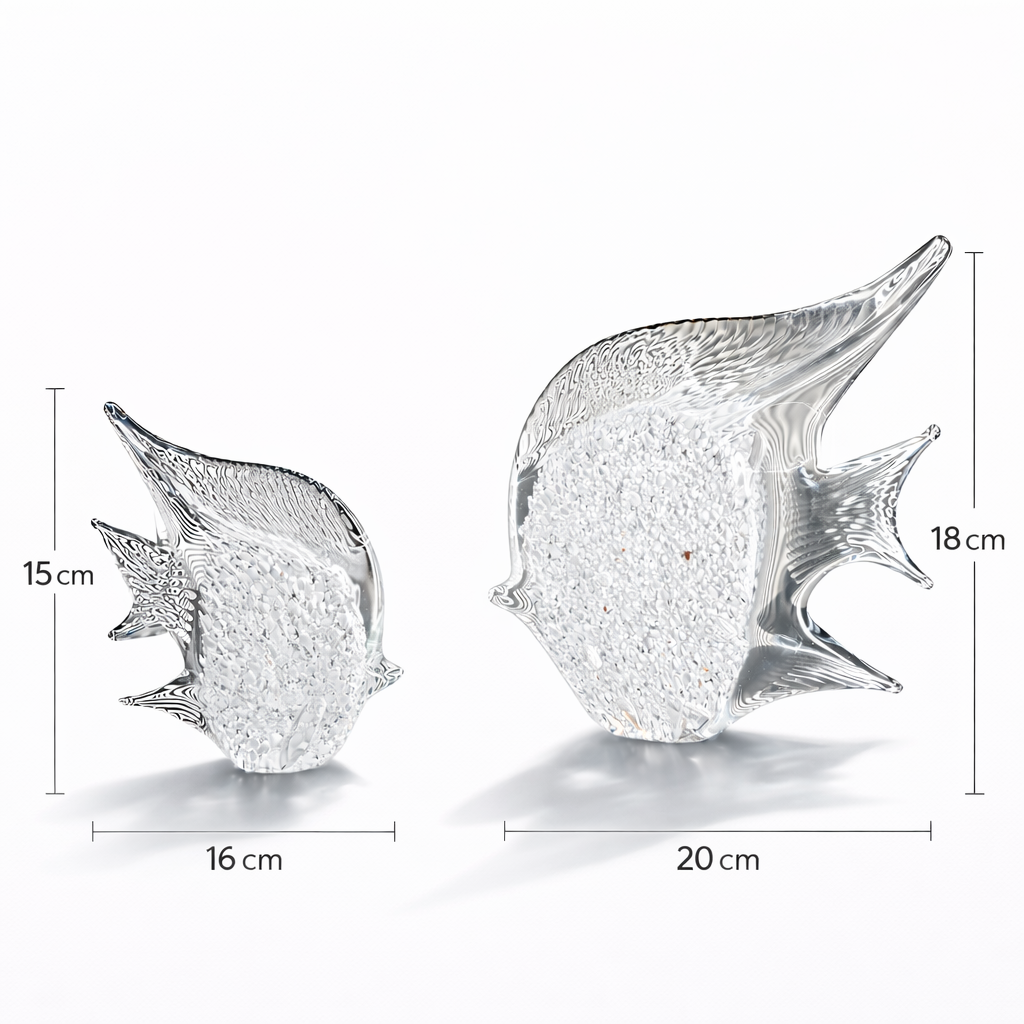 Camın zarif akışkan formunu kristal dokunun ışıltısıyla buluşturan sofistike bir dekor objesi setidir. Şeffaf cam yüzeyin içinde yer alan kristal dokular, ışıkla temas ettiğinde adeta suyun içindeki hareket hissini yansıtarak mekâna dinamik ve lüks bir atmosfer kazandırır. Organik balık formu; akış, huzur ve bereket temasını temsil ederken, modern luxury dekorasyonlarda konsol, sehpa veya vitrin üstlerinde güçlü bir odak noktası oluşturur. Casetti stiline uyumlu, zamansız ve sanatsal bir tasarım parçasıdır.