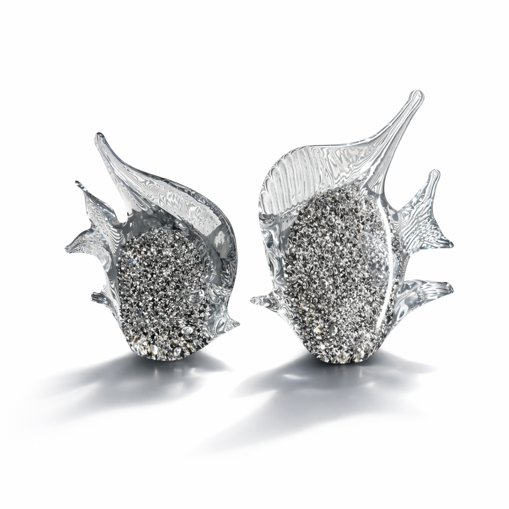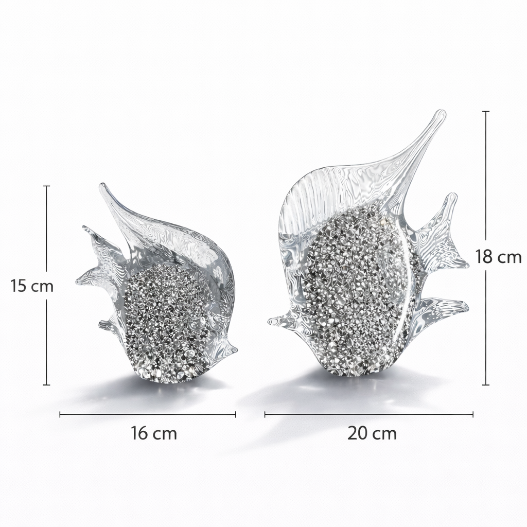 Camın zarif akışkan formunu kristal dokunun ışıltısıyla buluşturan sofistike bir dekor objesi setidir. Şeffaf cam yüzeyin içinde yer alan kristal dokular, ışıkla temas ettiğinde adeta suyun içindeki hareket hissini yansıtarak mekâna dinamik ve lüks bir atmosfer kazandırır. Organik balık formu; akış, huzur ve bereket temasını temsil ederken, modern luxury dekorasyonlarda konsol, sehpa veya vitrin üstlerinde güçlü bir odak noktası oluşturur.