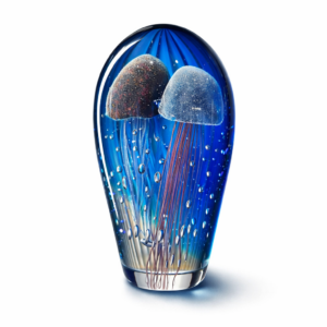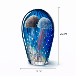 Derin lacivert tonların içinden süzülen iki zarif denizanası formu, ışıkla birlikte hareket ediyormuş hissi verir. İçindeki mikro hava kabarcıkları, objeye gerçek bir deniz derinliği atmosferi kazandırır.
