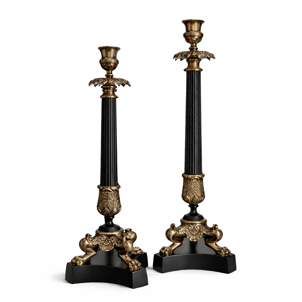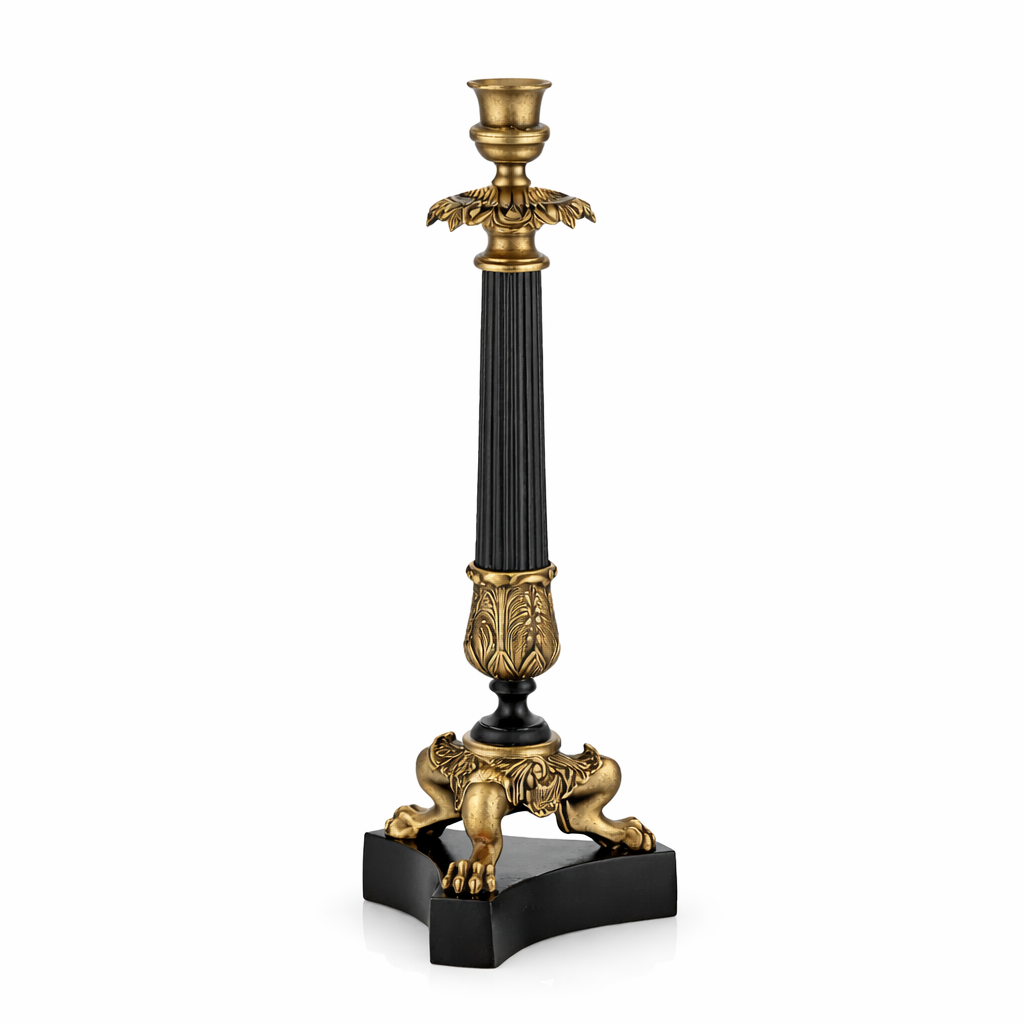 40.5 cm yüksekliğinde pirinç döküm aslan ayaklı şamdan, klasik Avrupa tasarımından ilham alan gösterişli bir dekoratif aksesuardır. Yüksek kaliteli pirinç döküm gövdesi, siyah sütun detayı ve dekoratif işlemeleri ile dikkat çeker. Alt kısmındaki aslan pençesi ayaklar, ürüne güçlü ve klasik bir görünüm kazandırır. Yemek masası, konsol, şömine üstü veya klasik dekorasyonlarda şık bir tamamlayıcıdır.