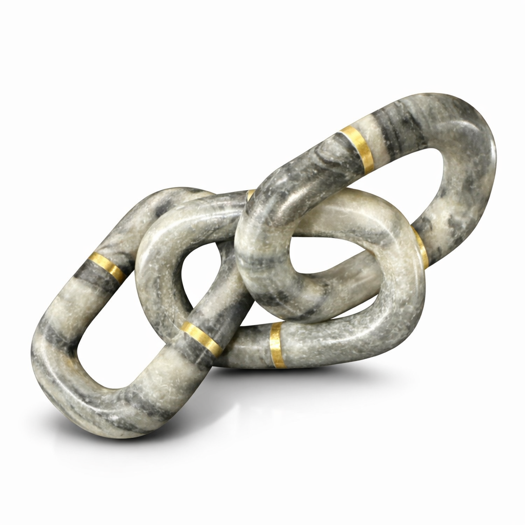 Bu soyut mermer zincir halka , yaşam alanlarına hareket duygusu ve sanatsal bir derinlik kazandıran seçkin bir dekor objesidir. Birbirine geçen halkaları, dumanlı gri mermer görünümlü yüzeyi ve zarif altın detaylarıyla; sehpa, konsol, kitaplık ve ofis düzenlemelerine modern bir galeri havası taşır. Çağdaş iç mekânları, özenle kurgulanmış minimal dekorasyonu ve güçlü vurgu parçalarını sevenler için dengeli ama dikkat çekici bir stil sunar.