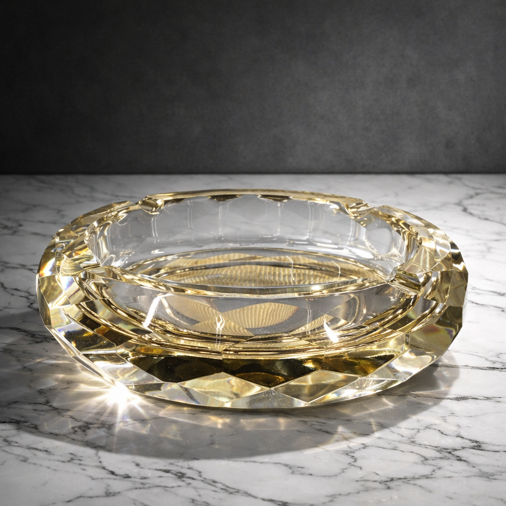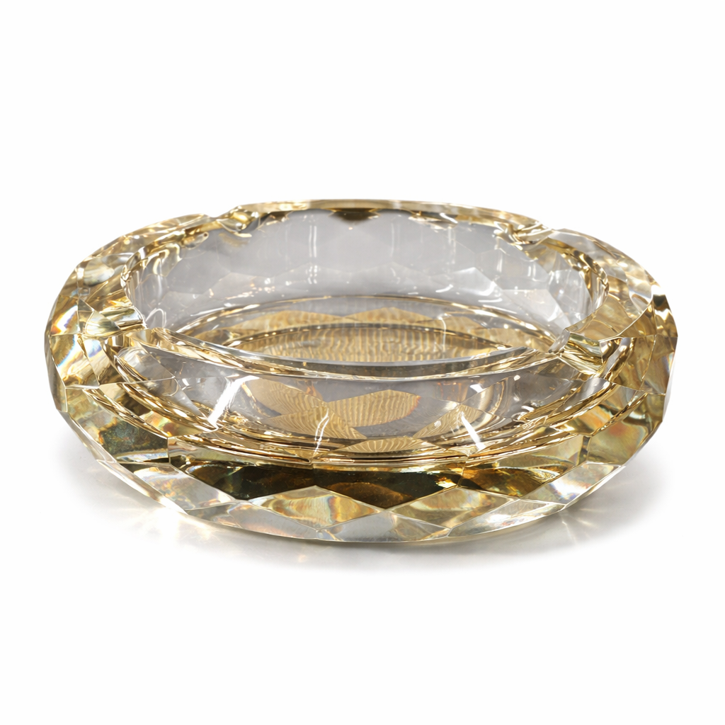 Golden Prism Kristal Cam Küllük, kesme kristal tasarımı ve altın tonlu yansıması ile lüks ve şık bir masa aksesuarıdır. Çok yüzeyli faceted cam yapısı ışığı kırarak bulunduğu ortamda zarif bir parıltı ve prestijli bir görünüm oluşturur.