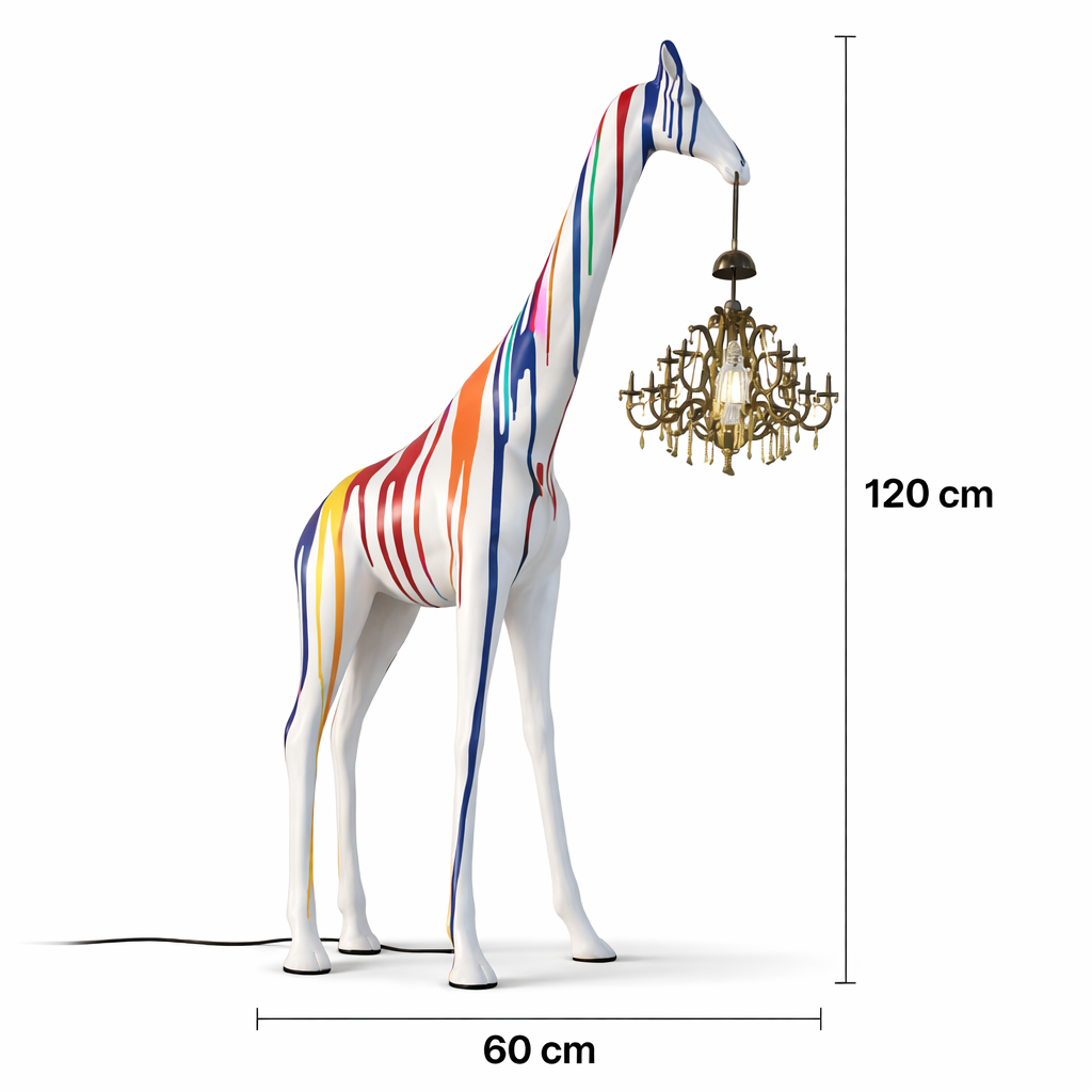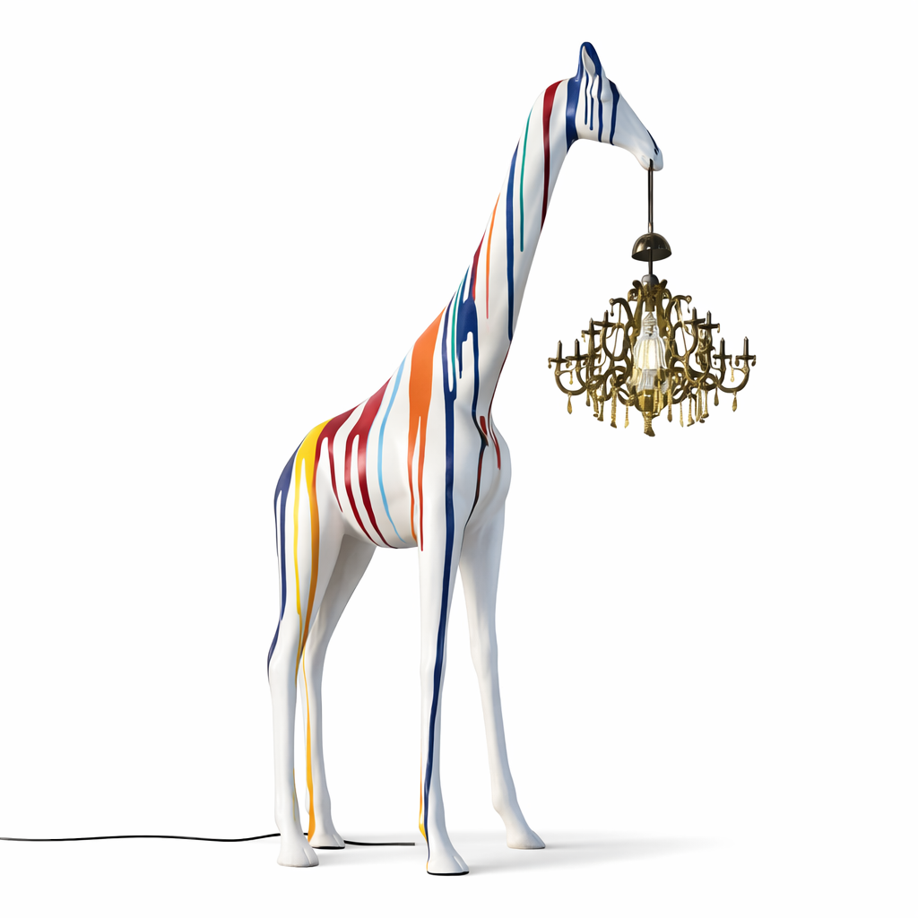 Uzun zürafa formu mekânda güçlü bir dikey vurgu oluştururken, üzerindeki renk akıtma (color drip) tasarımı modern sanat galerilerinden ve sokak sanatından ilham alır. Zürafanın ağzından sarkan avize tarzı aydınlatma, klasik lüks ile modern sanatın eğlenceli bir birleşimini sunar.