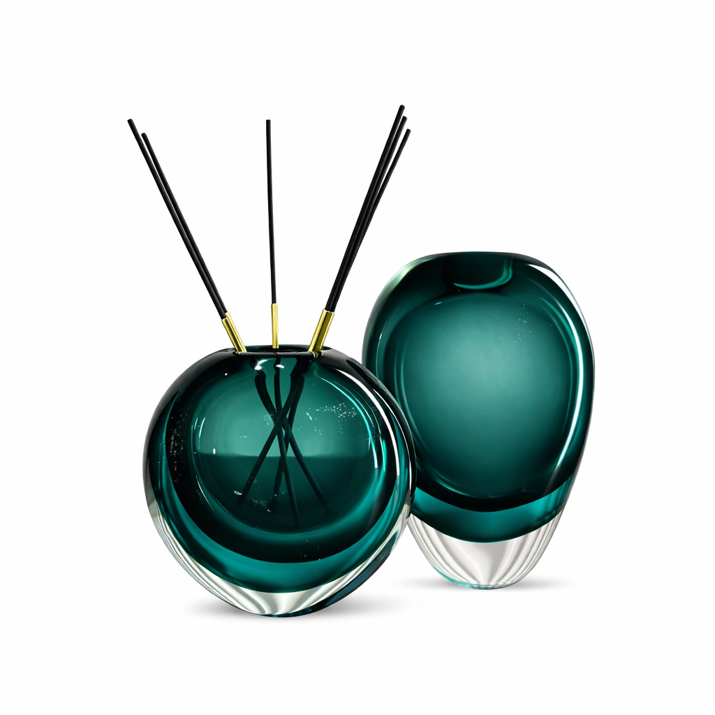 Derin zümrüt tonlu cam, ışığı katmanlı biçimde kırarak iç dokudaki dalgalı formu görünür kılar. Bu hacimli yapı, ürünü yalnızca fonksiyonel bir diffuser değil; mekâna karakter kazandıran heykelsi bir obje haline getirir.