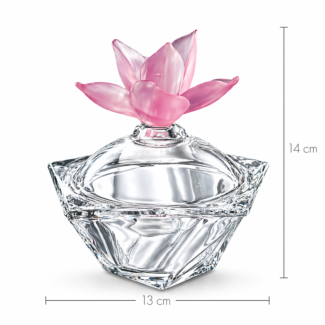 Tamamen cam kristalden üretilmiş zarif şekerlik modeli, şık tasarımı ve göz alıcı detaylarıyla sofralarınıza estetik bir dokunuş katıyor. Kristal cam gövdesi ışığı yansıtarak lüks bir görünüm sunarken, üst kısmındaki gül kapak detayı dekoratif bir şıklık sağlar. Şekerlik, lokumluk, çikolatalık veya dekoratif sunumluk olarak kullanıma uygundur.