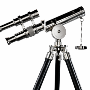 Klasik denizcilik ve astronomi temalarından ilham alan bu vintage teleskop modeli; çalışma odası, ofis, salon, kütüphane, otel lobisi ve özel dekorasyon projelerinde güçlü bir stil tamamlayıcısıdır. Siyah ahşap görünümlü ayakları ile metal detayların uyumu, ürüne modern ve zamansız bir görünüm kazandırır.