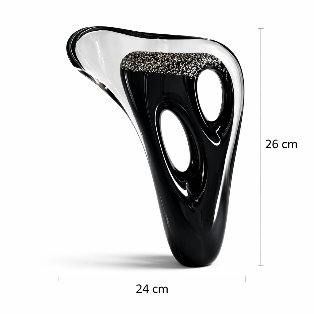 Zarif akışkan formu ve derin siyah cam yüzeyiyle, modern cam sanatının cesur bir yorumudur. Organik kıvrımları ve iç boşluk detayları, ışıkla etkileşime girerek her açıdan farklı bir silüet oluşturur. Üst bölümdeki altın dokulu yüzey, tasarıma sofistike bir kontrast katarak lüks bir dokunuş sağlar.