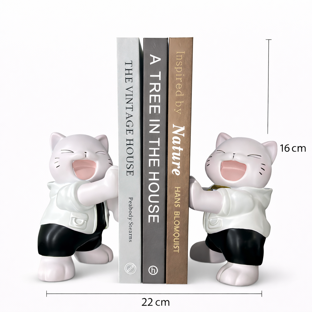 Bu sevimli kedi figürlü dekoratif kitap tutucu, raflarınıza eğlenceli ve sıcak bir karakter kazandırmak için tasarlanmıştır. Kitapları sarılıyormuş gibi tutan gülümseyen kedi figürleri sayesinde hem çocuk odaları hem de modern ev dekorasyonları için ideal bir tasarım sunar.