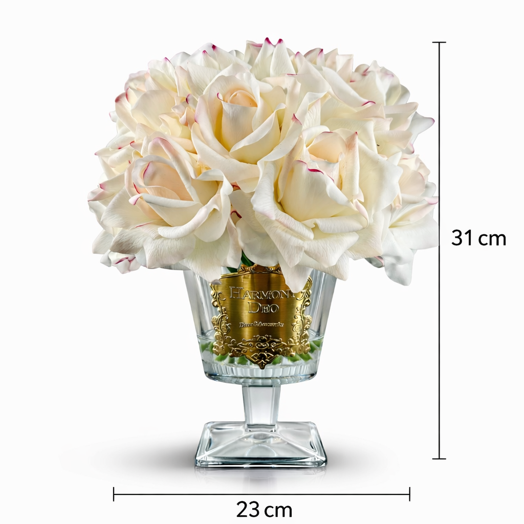 Krem güllerin zarafetiyle tasarlanmış bu lüks oda kokusu ile yaşam alanınıza romantik ve sofistike bir atmosfer katın. 31 cm yüksekliğinde ve 23 cm genişliğindeki bu dekoratif ürün, hem estetik hem de kalıcı koku deneyimi sunar.
