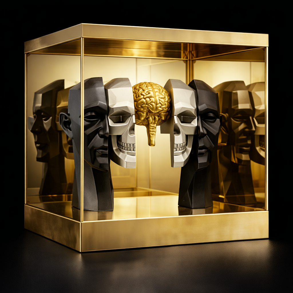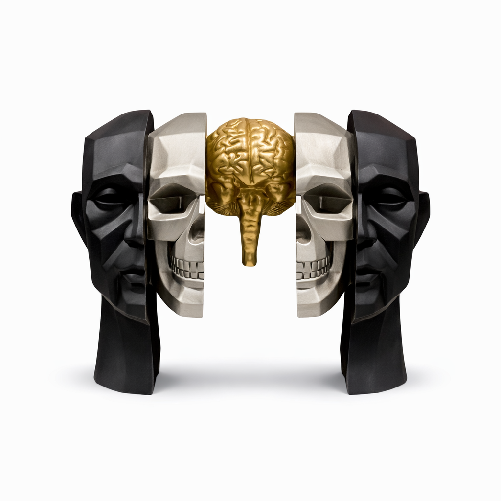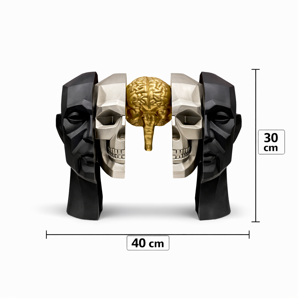 Farklı yüz katmanları ve ortadaki altın beyin detayıyla bu heykel; zihin, algı ve bilinç kavramlarını simgeler. Siyah, metalik ve altın tonlarının birleşimi, ürüne modern ve lüks bir görünüm kazandırır.