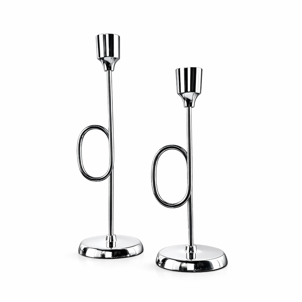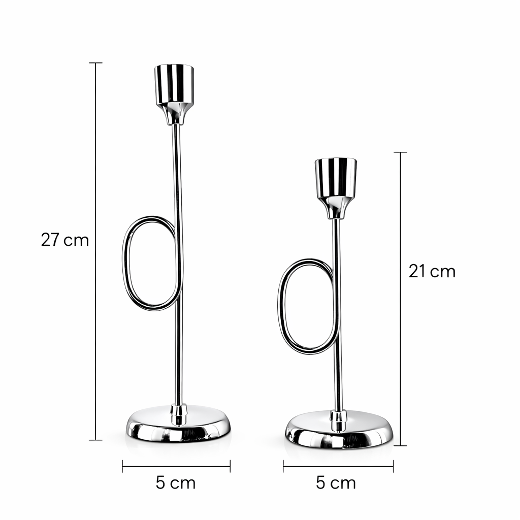 Modern ve şık tasarımıyla dikkat çeken ikili gümüş şamdan seti, yaşam alanlarınıza estetik ve çağdaş bir dokunuş kazandırır. Parlak gümüş rengi yüzeyi, zarif hatları ve minimal formu sayesinde salon, yemek odası, antre, konsol, dresuar, sehpa ve masa üstlerinde dekoratif aksesuar olarak kullanılabilir. Modern, minimalist, avangart ve klasik dekorasyon tarzlarına uyum sağlayan özel bir tamamlayıcıdır.