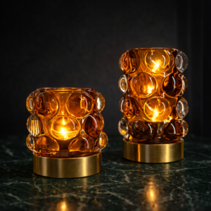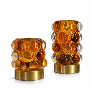 Modern tasarımı ve şık görünümüyle dikkat çeken 2’li cam dekoratif aydınlatma seti, yaşam alanlarınıza estetik ve sıcak bir atmosfer kazandırır. Özel kabarcık desenli turuncu cam gövdesi ve zarif gold tabanı ile salon, yatak odası, çalışma odası, konsol, komodin ve masa üstü dekorasyonunda göz alıcı bir tamamlayıcıdır.