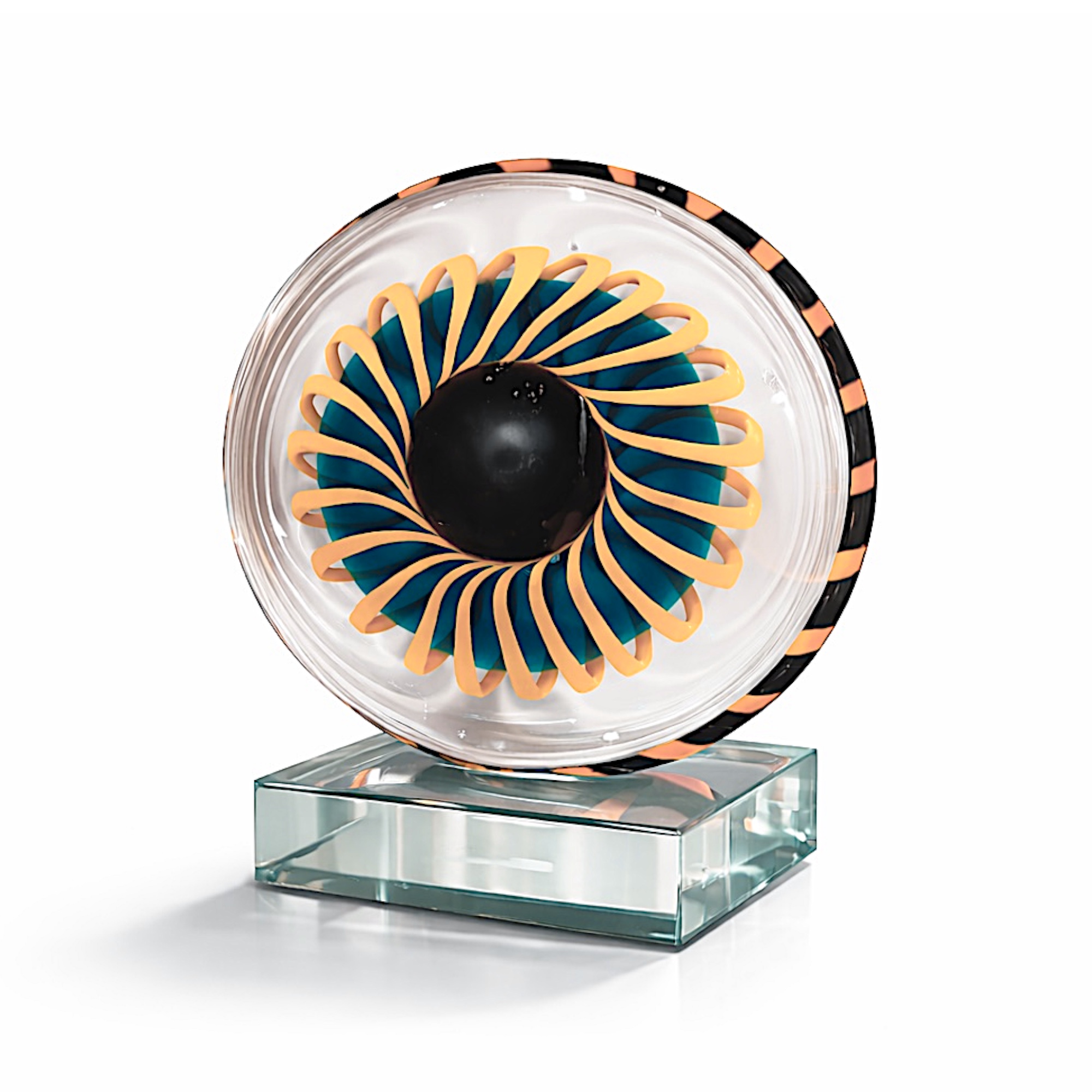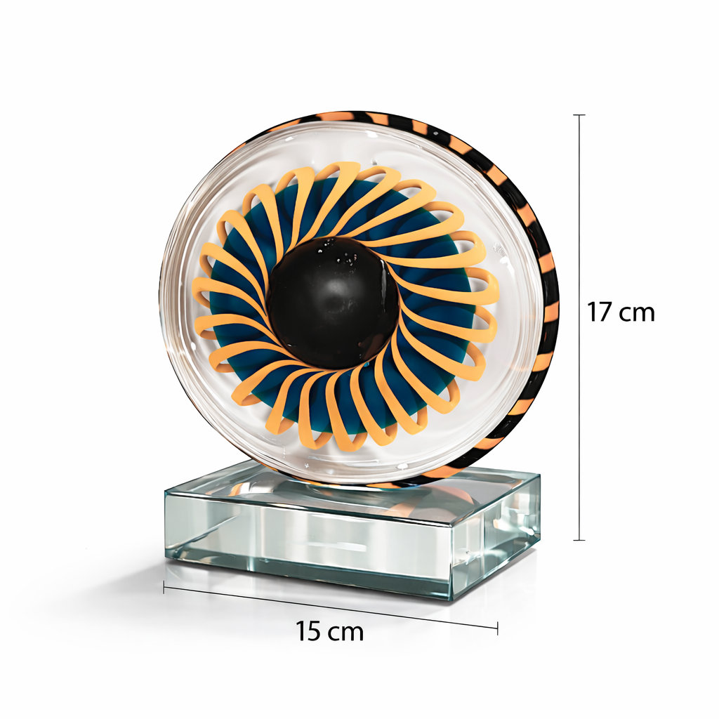 Murano tarzı soyut cam heykel, güneş yörüngesini ve geometrik hareketi andıran büyüleyici spiral disk tasarımına sahiptir. Turkuaz, amber ve siyah cam katmanlarının birleşimi ışığı farklı açılardan yakalayarak güçlü bir görsel etki oluşturur. Şeffaf kristal taban üzerine yerleştirilen bu modern cam sanat eseri, modern evler, ofisler ve galeri tarzı iç mekanlar için lüks bir dekoratif obje olarak öne çıkar.