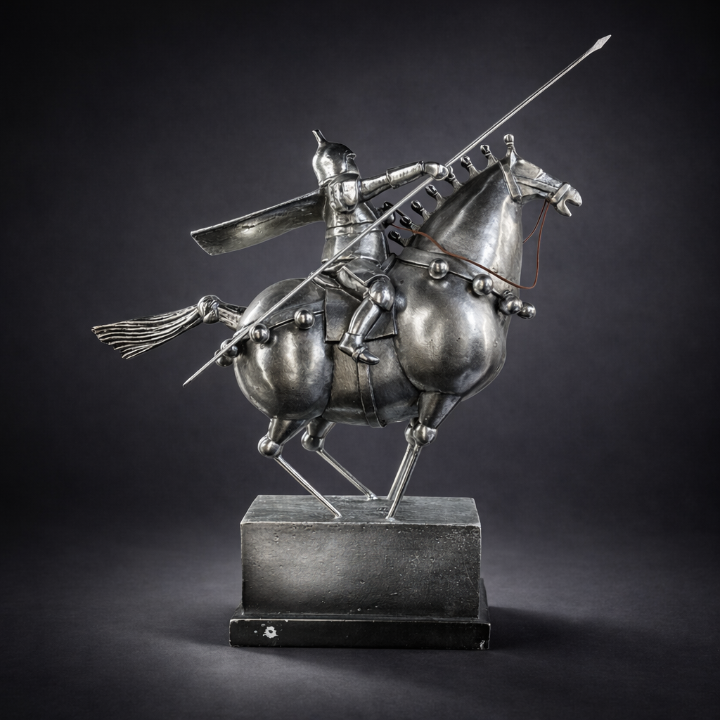 Heykelin vintage gümüş tonlu metal yüzeyi, eskitme bir görünüm sağlayarak tarihi atmosferi daha güçlü hissettirir. Atın hareketli formu ve şövalyenin savaş pozisyonu, tasarıma dinamik ve etkileyici bir karakter kazandırır.