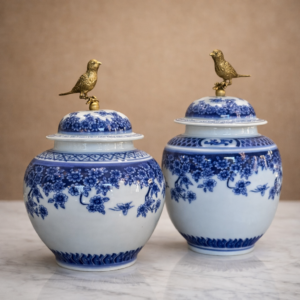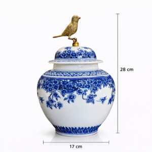 Döküm kuş figürlü kapaklı mavi beyaz porselen ginger jar, klasik Çin porselen sanatından ilham alan zarif bir dekoratif objedir. Beyaz porselen üzerinde kobalt mavi çiçek desenleri ve kapağındaki altın kuş figürü, ürüne hem sanatsal hem de lüks bir görünüm kazandırır. Chinoiserie stilini yansıtan bu dekoratif kavanoz, salon, konsol, vitrin veya raf dekorasyonu için mükemmel bir seçimdir.