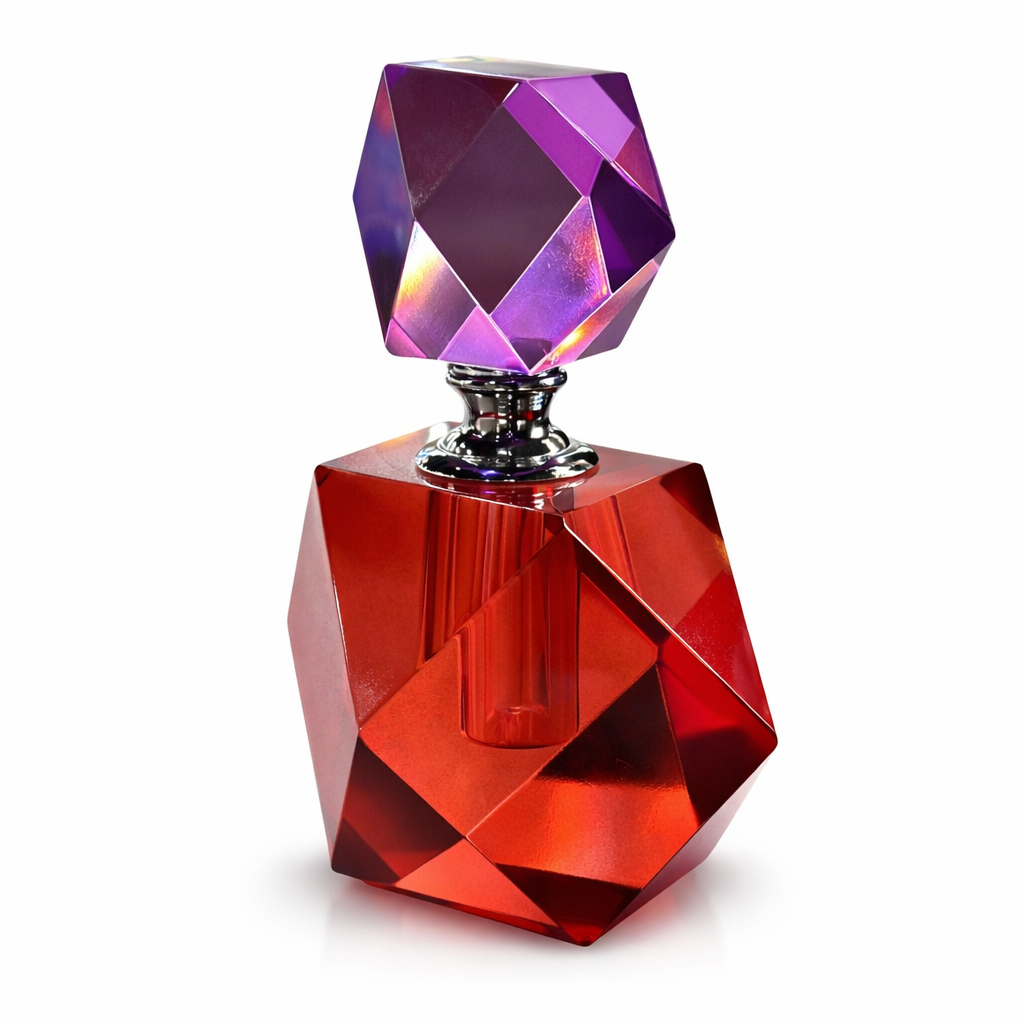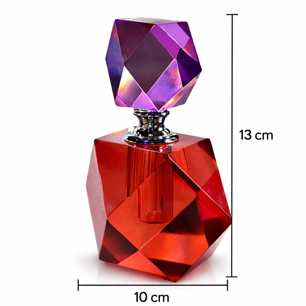 Dekoratif parfüm şişesi ile yaşam alanınıza modern ve lüks bir dokunuş katın. 13 cm yüksekliğinde ve 10 cm genişliğindeki bu özel tasarım, kırmızı ve mor tonlarının ışıltılı geçişleri ile dikkat çeken geometrik formu sayesinde bulunduğu ortama sofistike bir hava kazandırır.