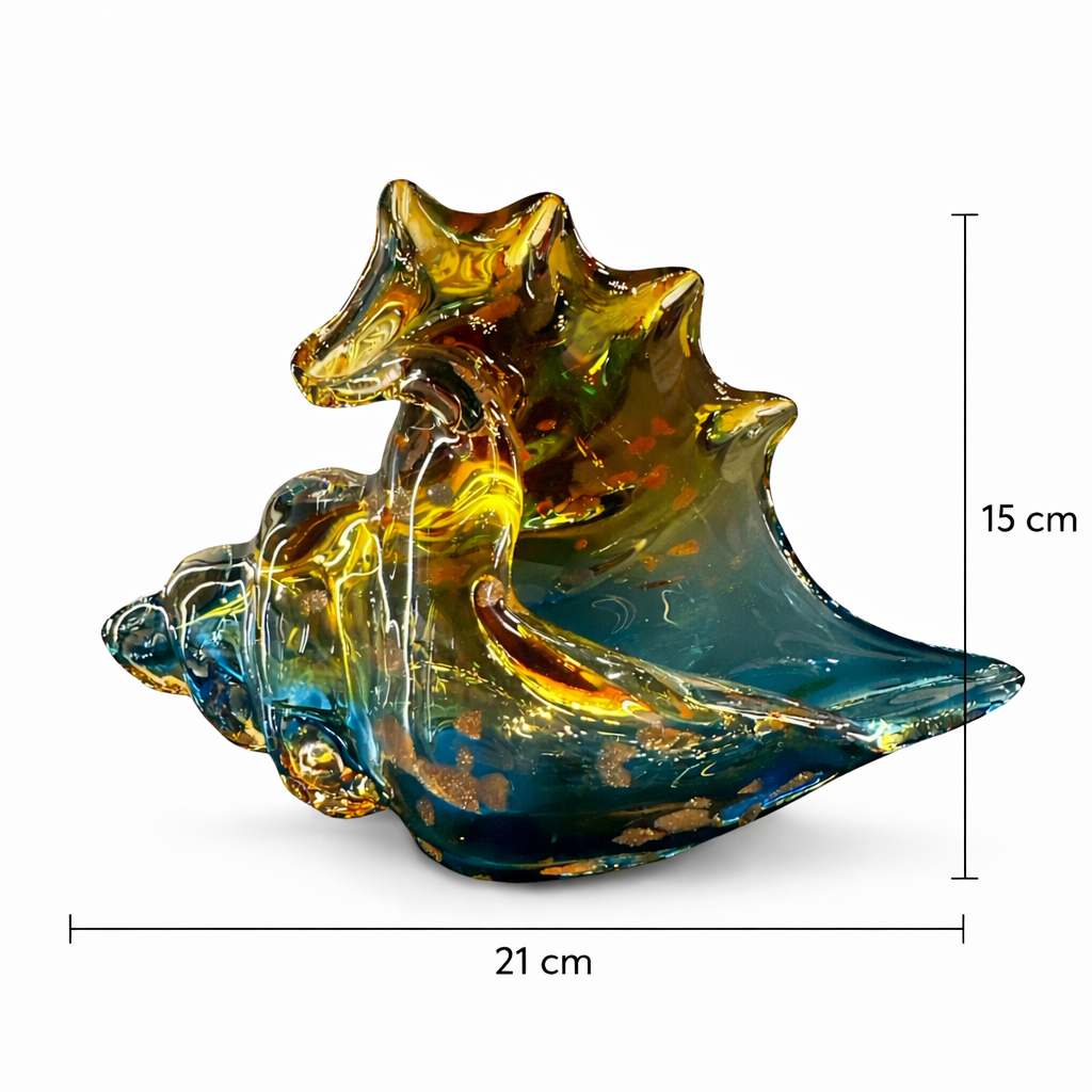 İtalyan Murano cam sanatından esinlenen bu özel tasarım, akıcı dalga formu ve cam içerisindeki altın tonlu parçacıklarla dikkat çeken lüks bir dekoratif obje olarak öne çıkar. Organik yapısı ve güçlü silueti sayesinde bulunduğu ortama sanatsal bir atmosfer kazandırır.