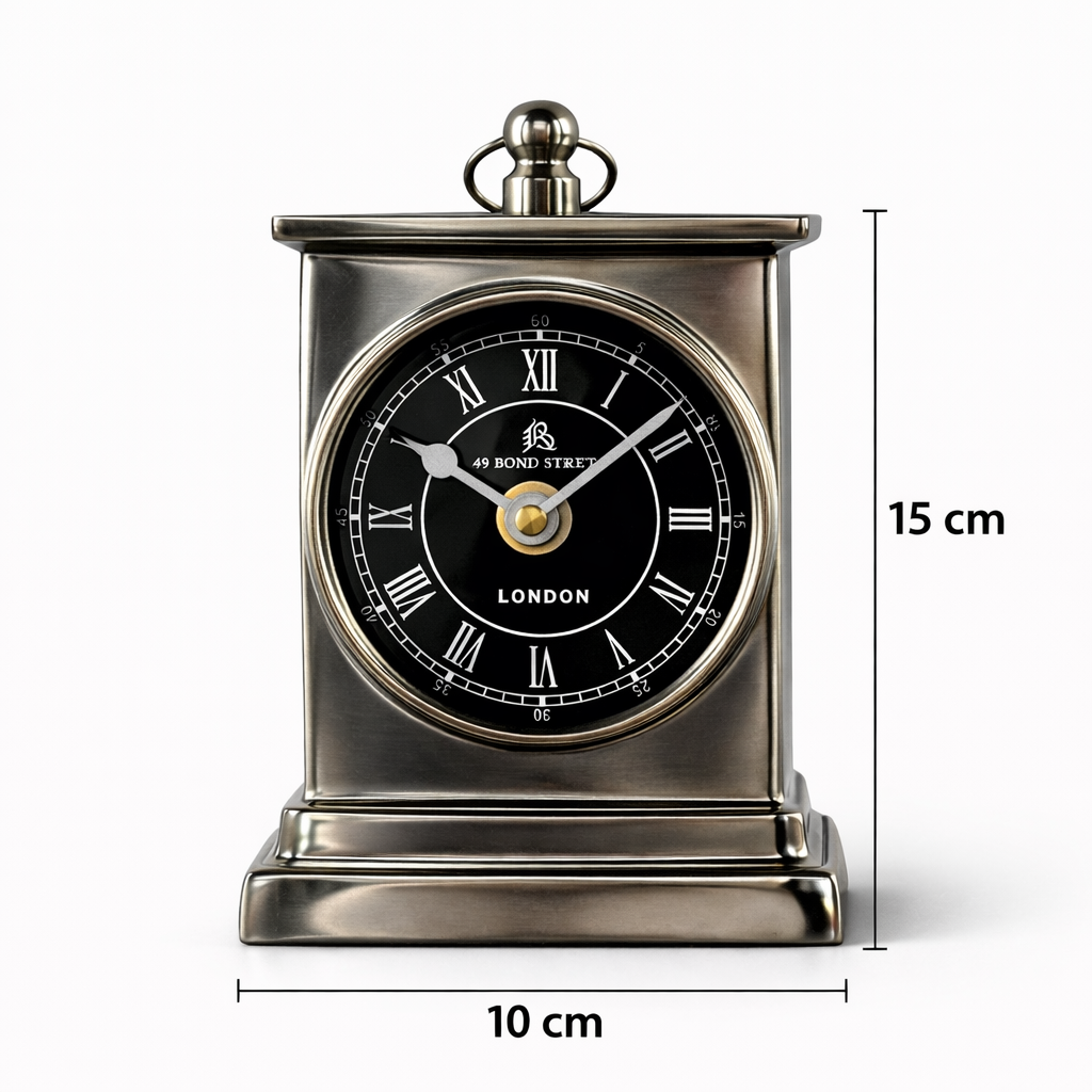 Bu London tarzı vintage masa saati, klasik İngiliz dekorasyonundan ilham alan zarif bir tasarıma sahiptir. Metal gövdesi, siyah kadranı ve Roma rakamlı saat tasarımı sayesinde bulunduğu ortama nostaljik ve prestijli bir atmosfer kazandırır.