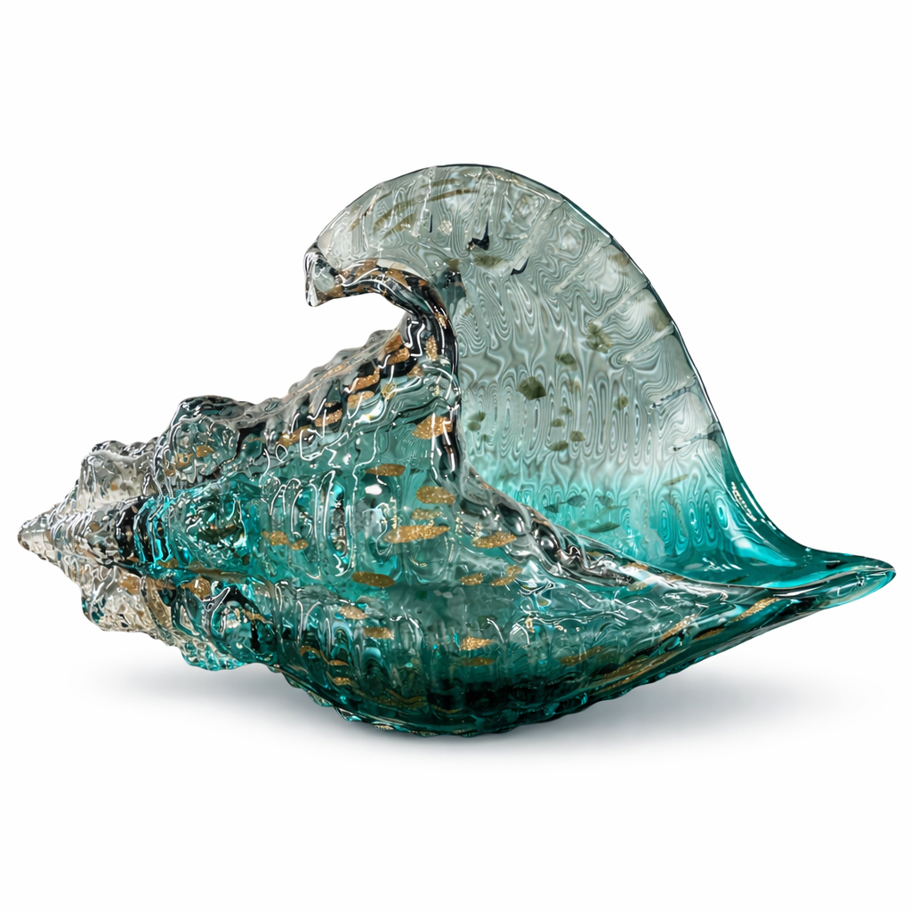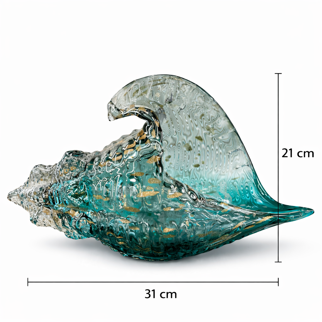 Okyanusun güçlü ve akıcı dalga hareketinden ilham alan benzersiz bir sanat eseridir. Derin okyanus mavisi, zümrüt yeşili, amber altın ve şeffaf cam tonlarının birleşimi, ışıkla buluştuğunda büyüleyici bir görsel etki yaratır.