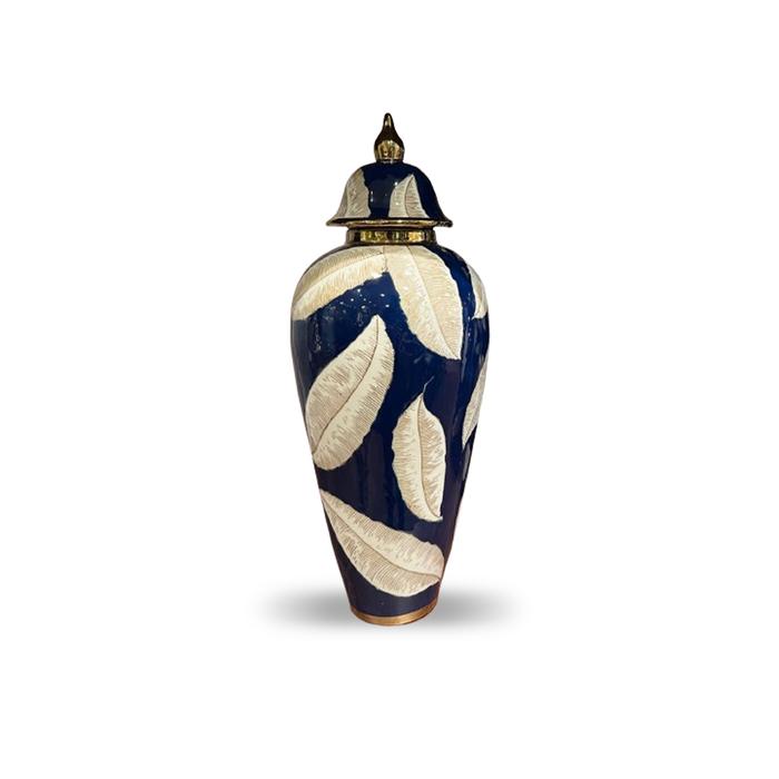 Zarafeti ve modern dokunuşu bir araya getiren bu navy–gold kapaklı dekoratif vazo, yaşam alanlarına güçlü bir karakter katar. El işçiliği detaylandırılmış altın tonlu yaprak motifleri, lacivert zeminin derinliğiyle birleşerek sofistike bir görünüm oluşturur.