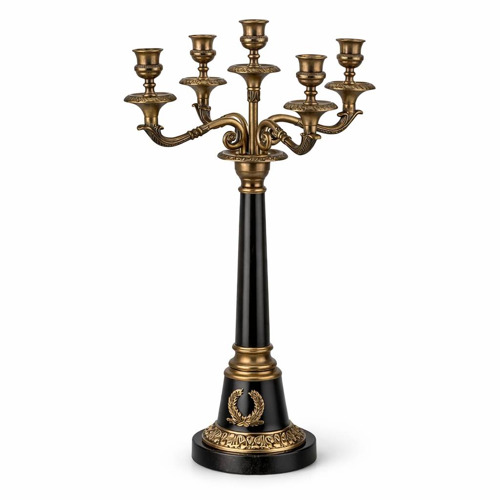 Bu saf pirinç döküm 5 kollu şamdan, klasik Avrupa saray ve neoklasik dekorasyon tarzlarından ilham alan zarif bir tasarıma sahiptir. Kıvrımlı şamdan kolları, uzun dekoratif sütun gövdesi ve detaylı pirinç işçiliği sayesinde bulunduğu mekânda güçlü bir dekoratif etki oluşturur. Siyah ve altın renk kombinasyonu, ürüne lüks ve zamansız bir görünüm kazandırır.