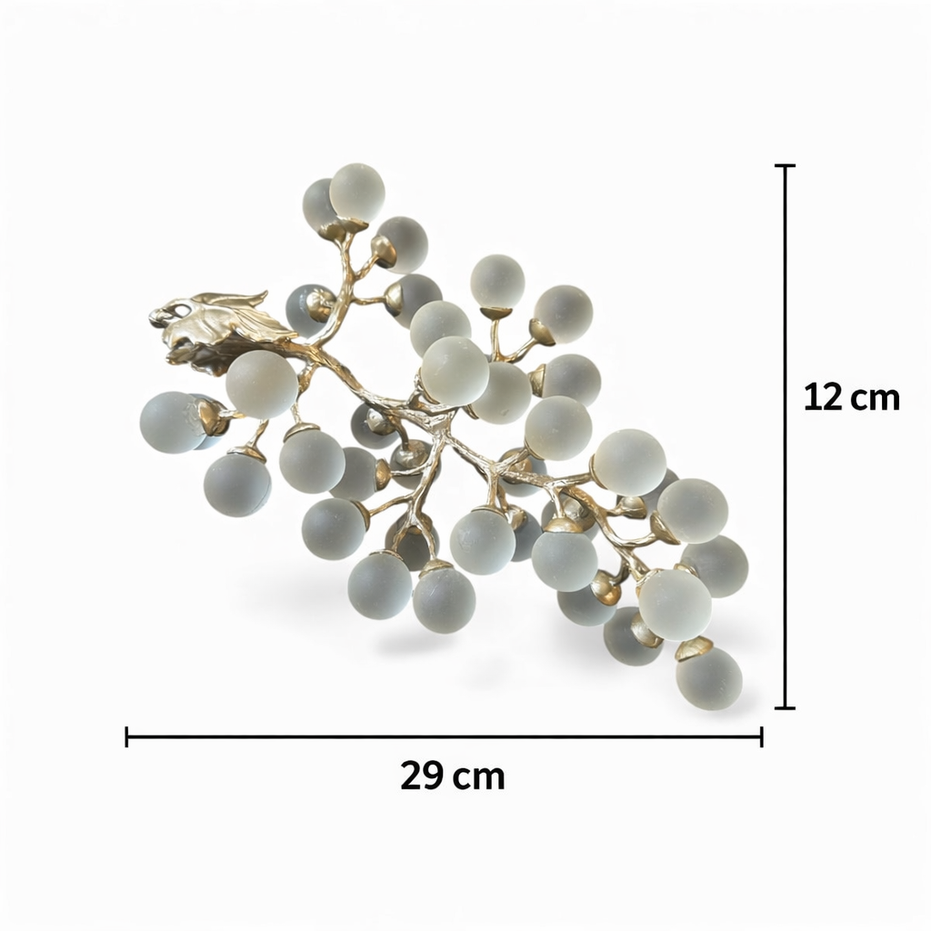 Casetti Home Pirinç Döküm Üzüm Dekoru, el işçiliğiyle üretilmiş pirinç gövdesi ve uç kısımlarındaki buğulu cam detaylarıyla yaşam alanlarına sofistike bir hava katıyor.